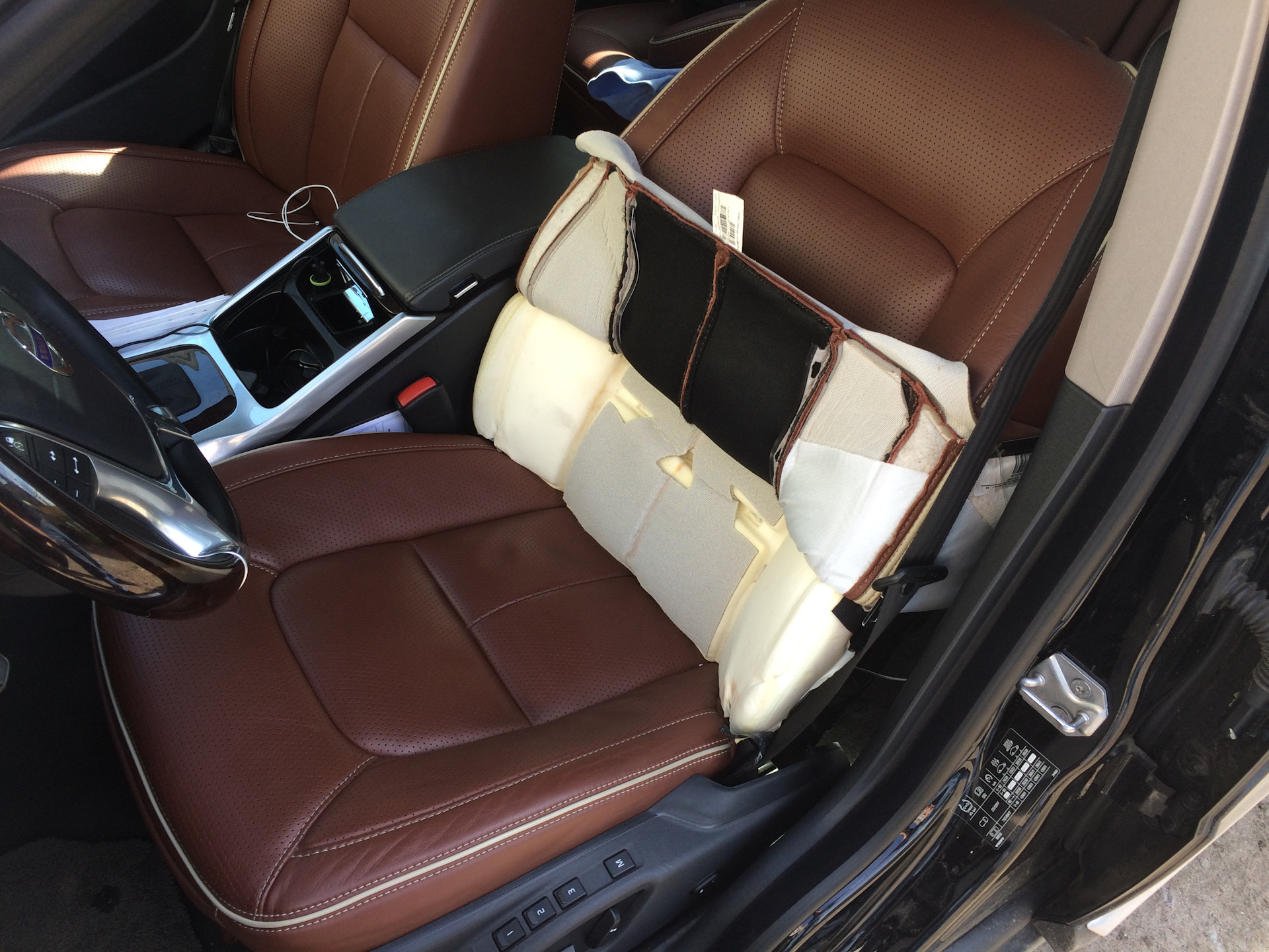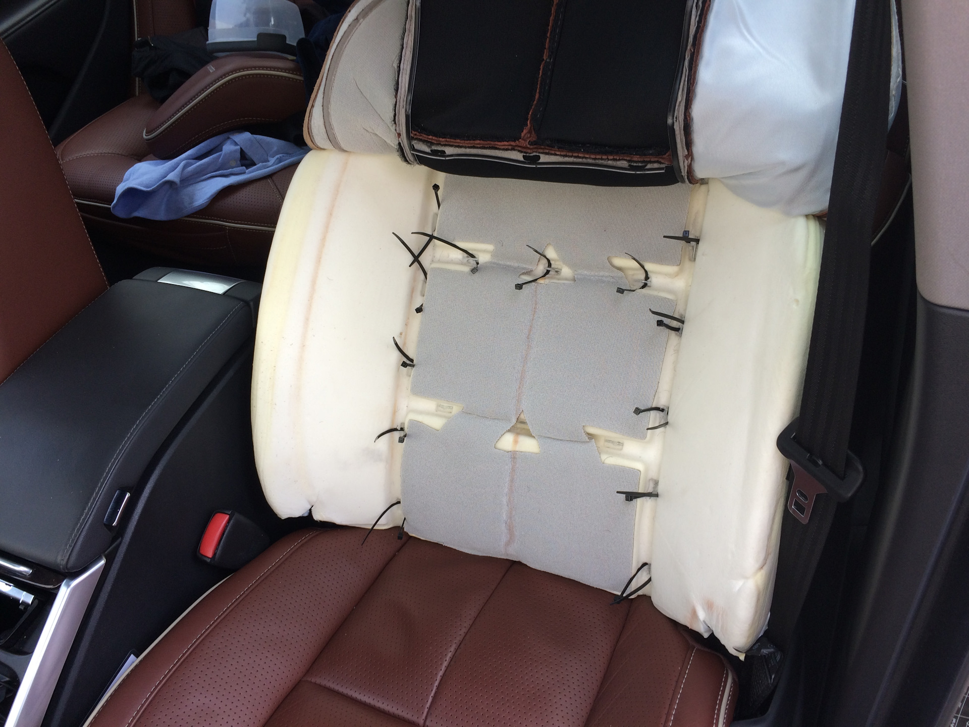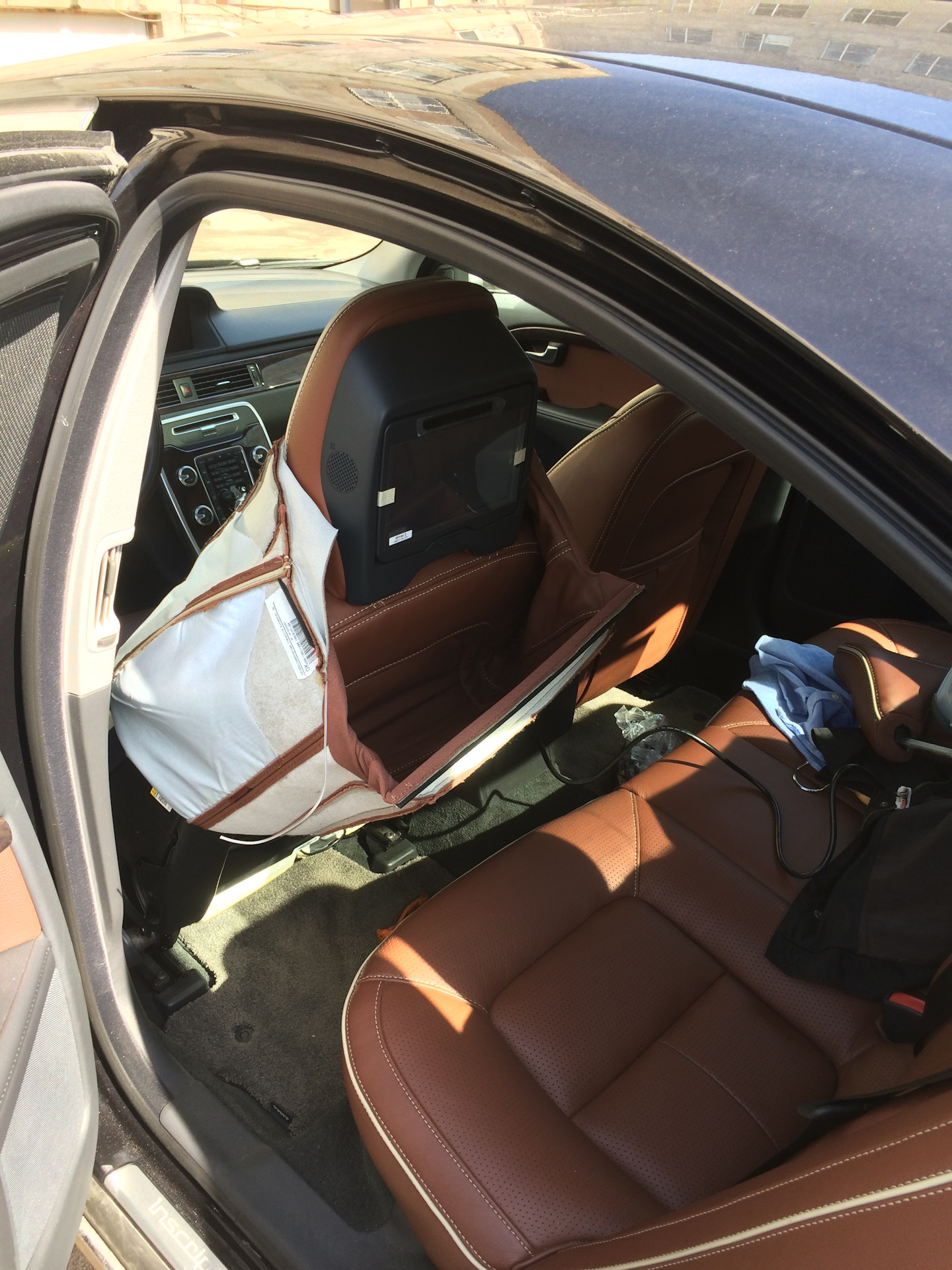 Дальше пошла установка подголовника. По инструкции необходимо прокинуть кондуктор под обшивкой и продернуть кабель по нему, но ввиду того что у меня Inscription кожа очень толстая и сшито все плотно этого не получилось. Пришлось снимать чехол со спинки.
