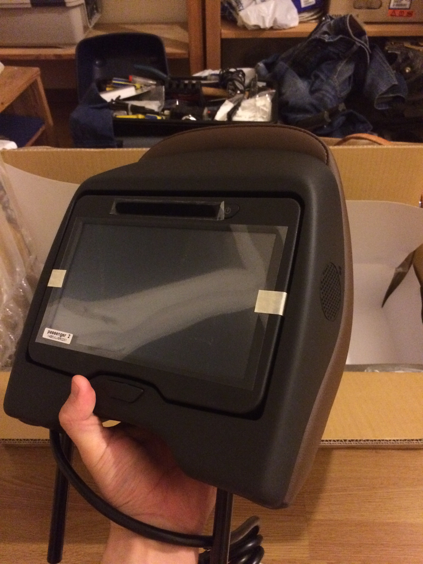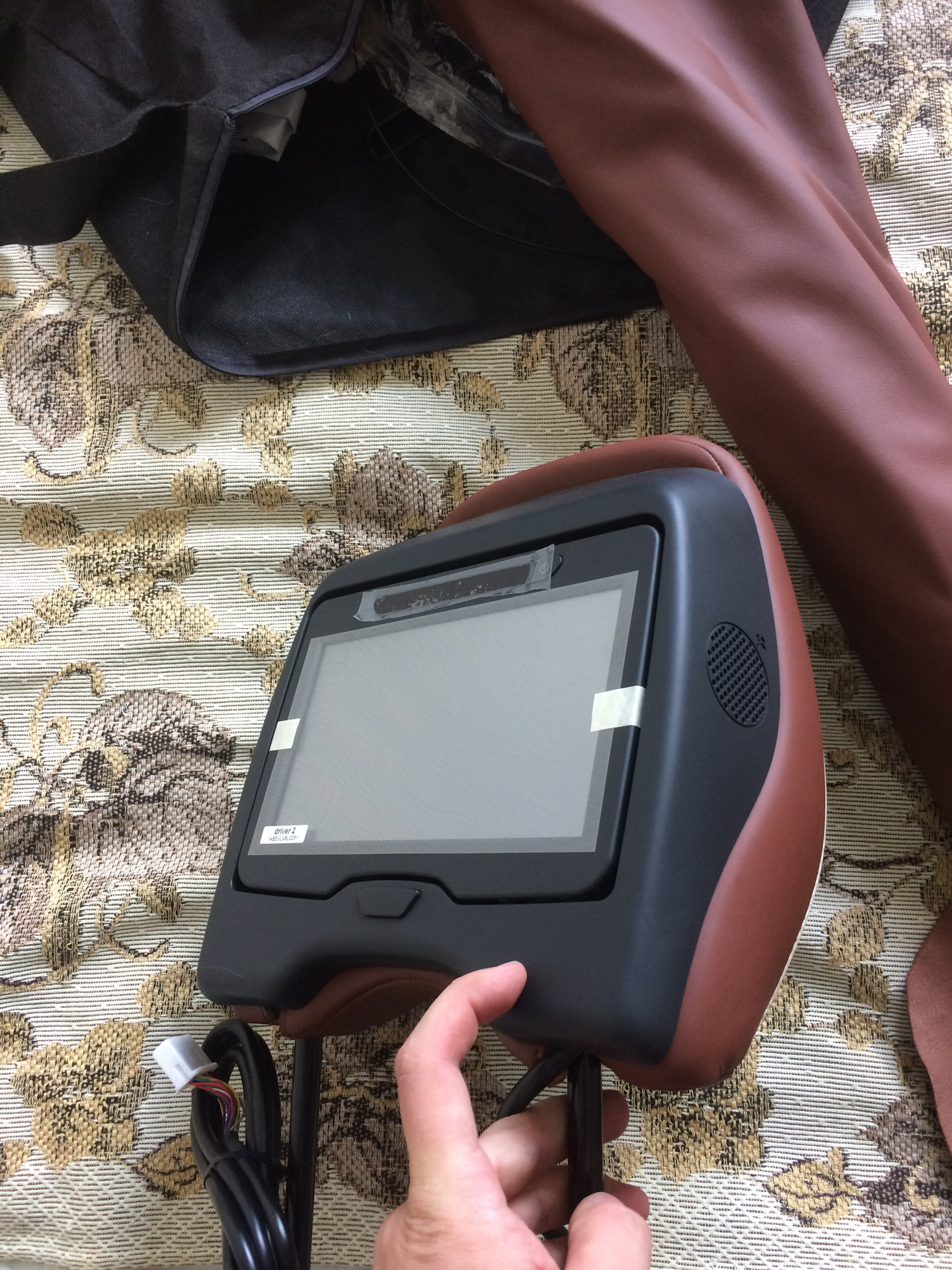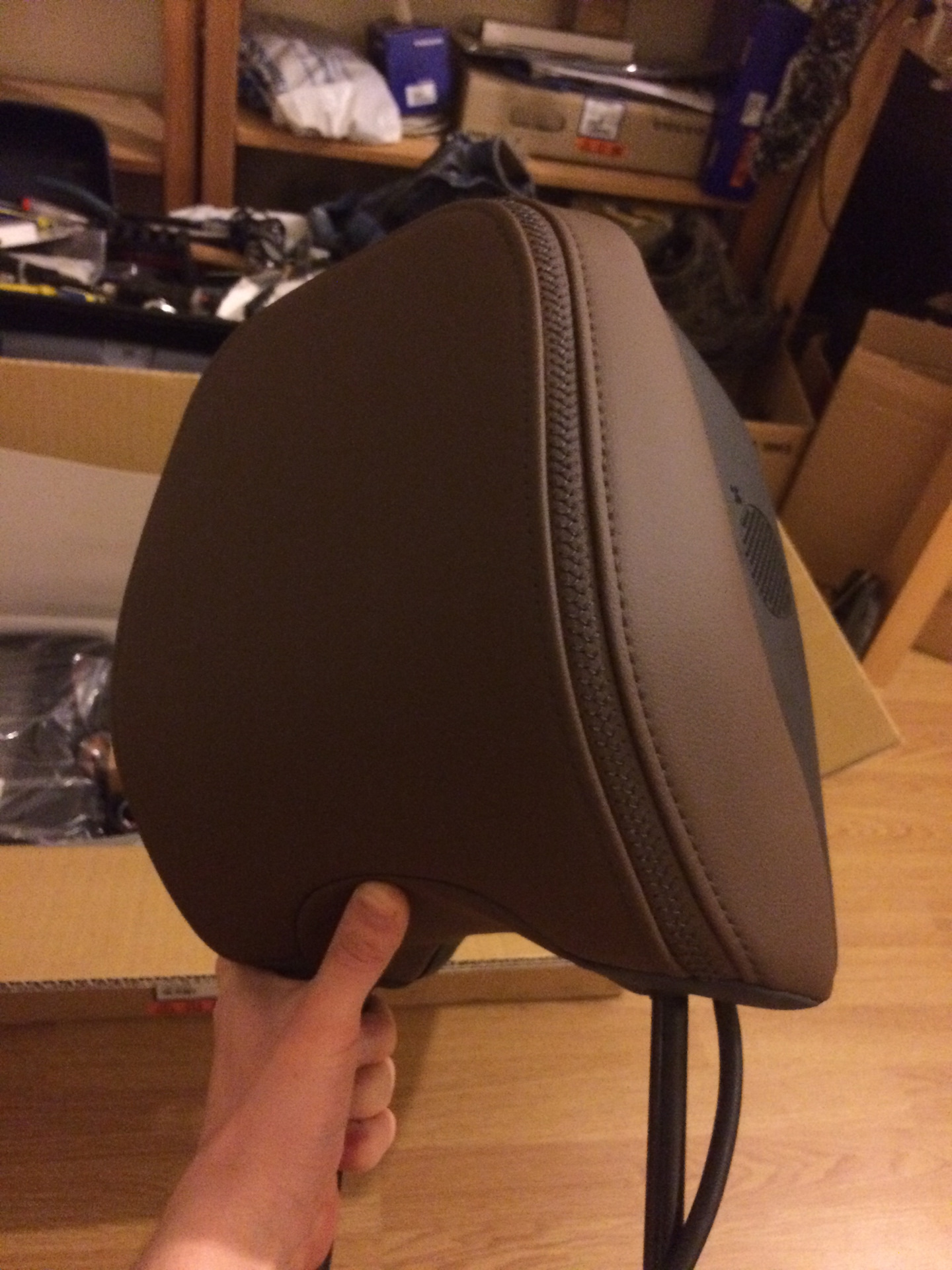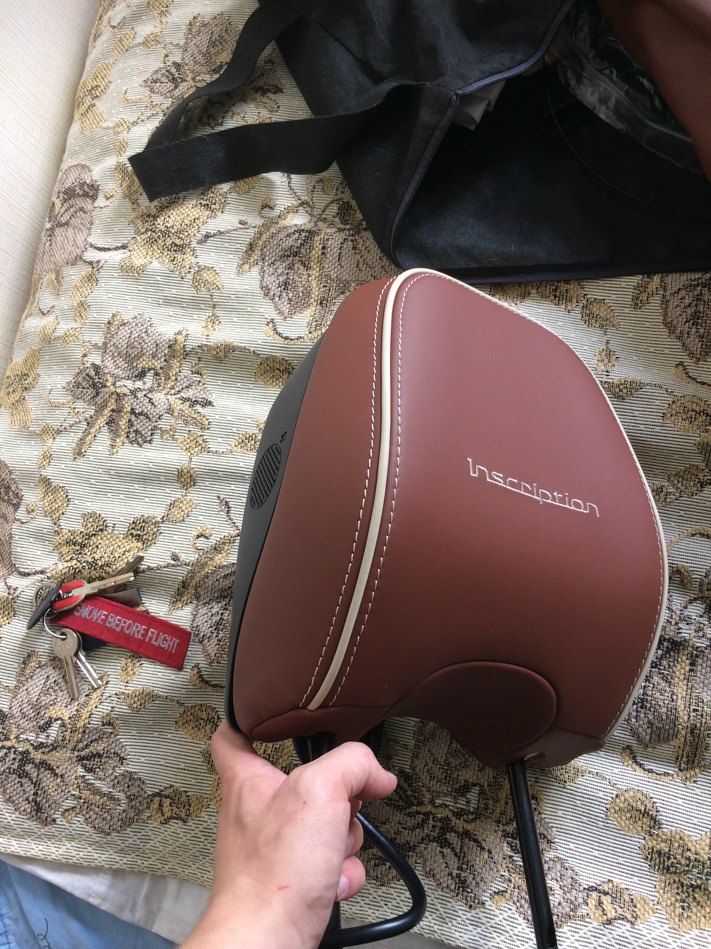 Дальше пошла установка подголовника. По инструкции необходимо прокинуть кондуктор под обшивкой и продернуть кабель по нему, но ввиду того что у меня Inscription кожа очень толстая и сшито все плотно этого не получилось. Пришлось снимать чехол со спинки.