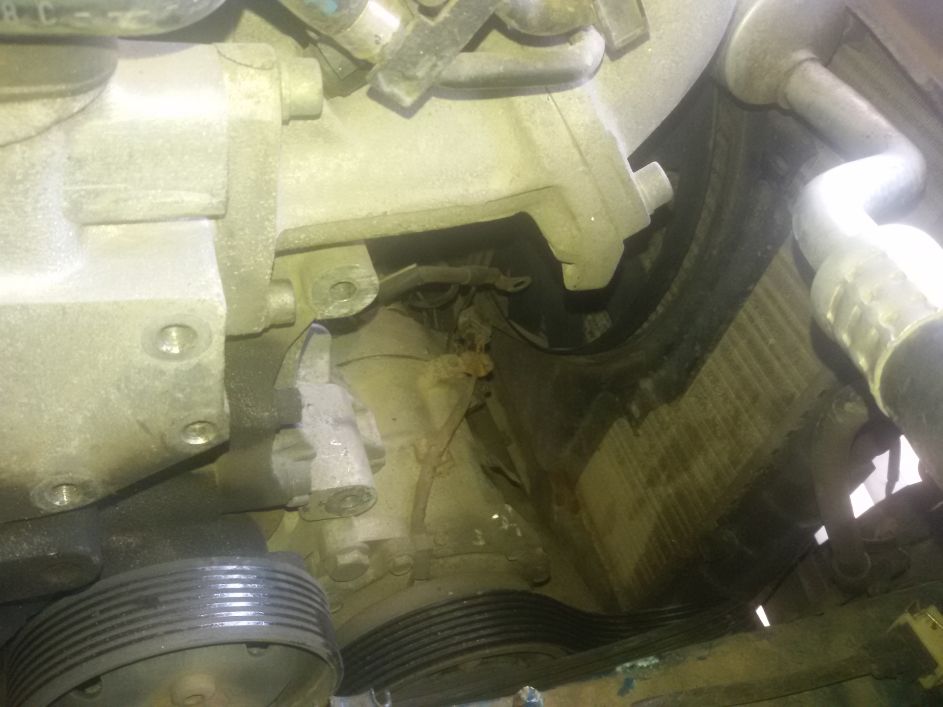 Затем начал собирать все обратно, поставил помпу, компрессор, гену, трубку с патрубками, опустил мотор обратно на подушки, закрутил заднюю, .а вот с передней сюрприз! В общем переусердствовал с затяжкой болта подушки, и сломал его(((( хотя зажимал только трещеткой, без всяких усилителей!