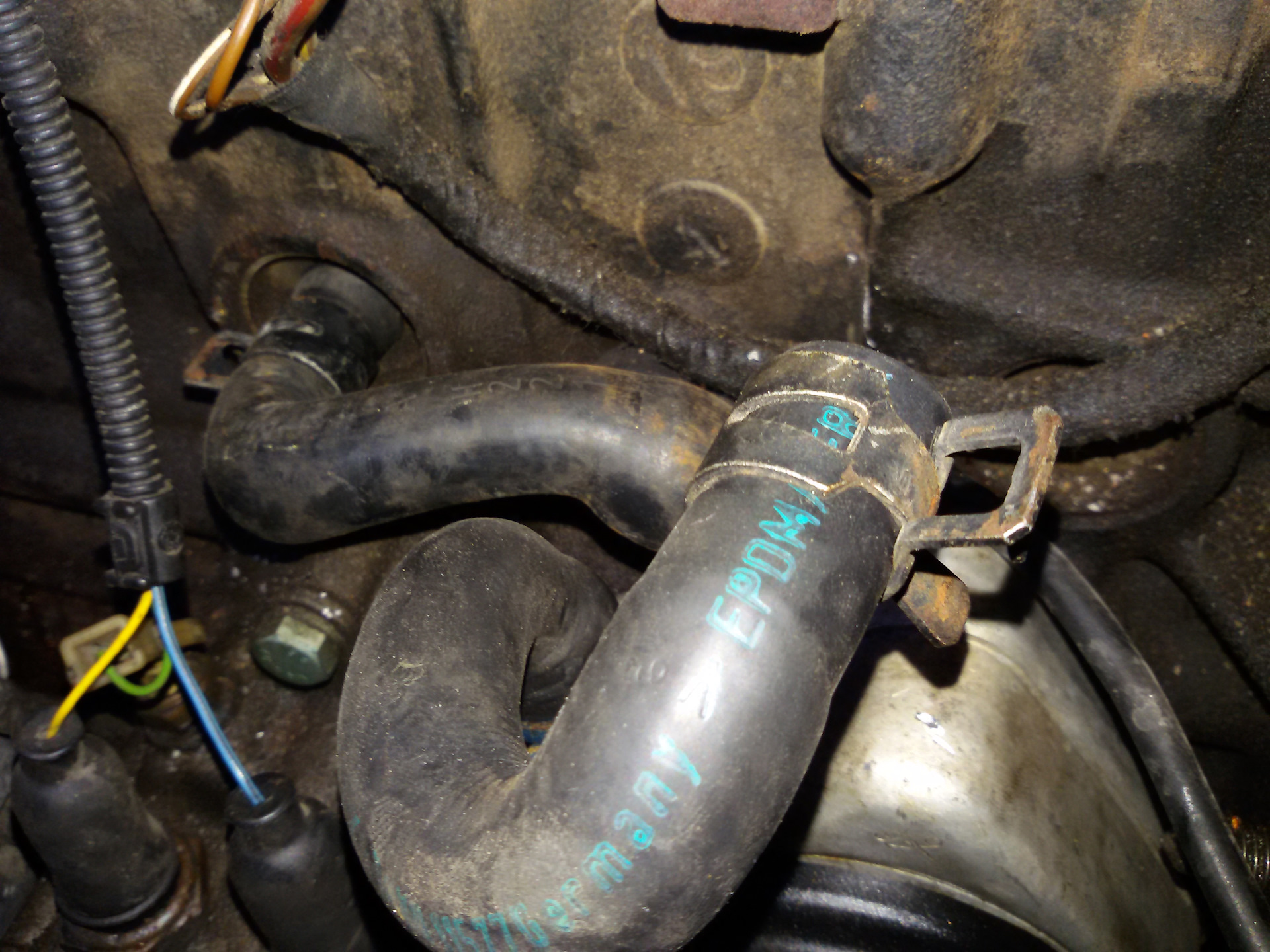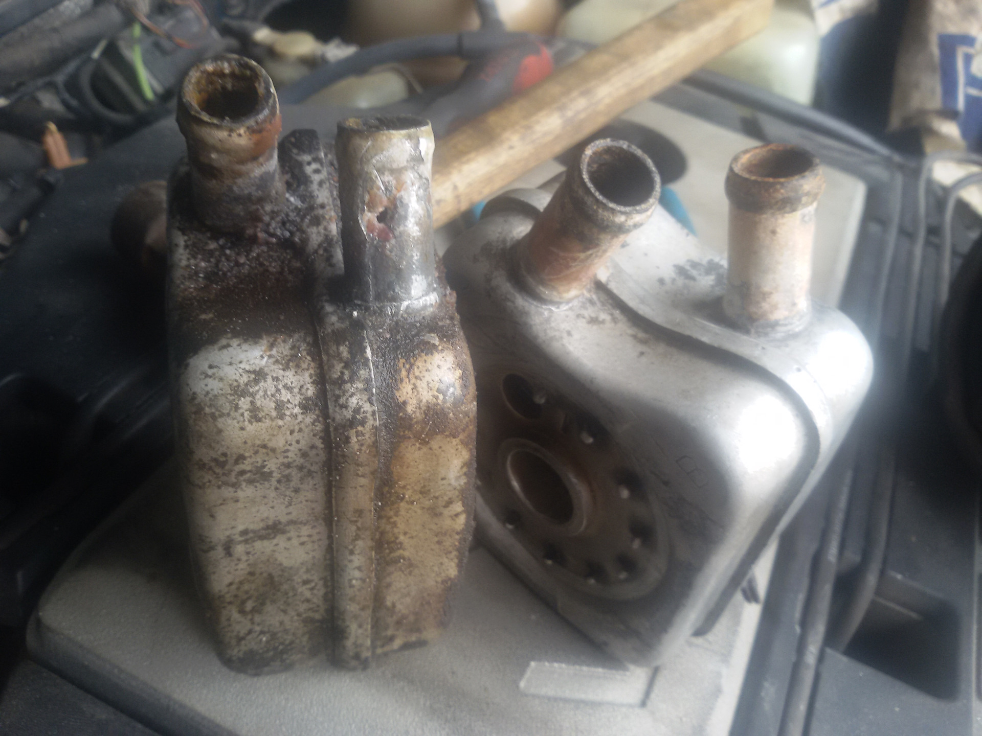 Еще меня поджидал сюрприз в виду дырявого второго патрубка маслоохладителя, хорошо был б/у оригинал, то поставил его. Когда снял патрубок с маслоохладителя, обнаружил прогнившую дырку на отводе, по этому опять же решил поставить старый б/у оригинал в хорошем состоянии! меняется просто, головка на 32, откручиваешь и меняешь!