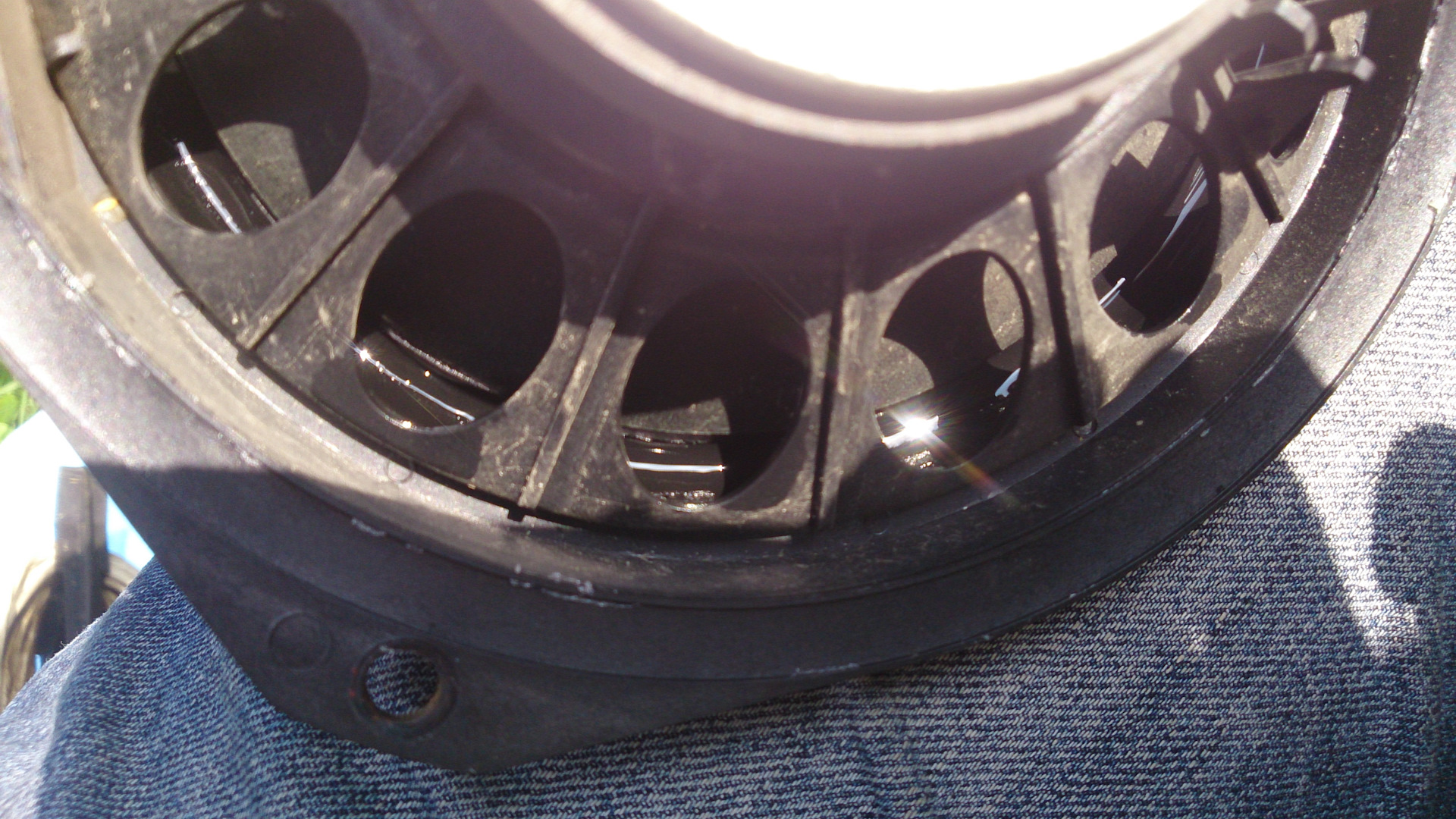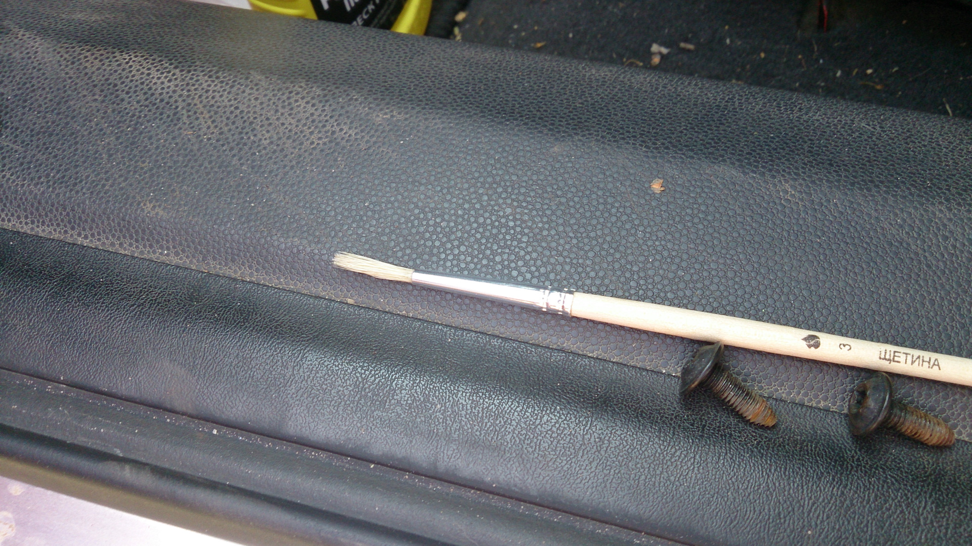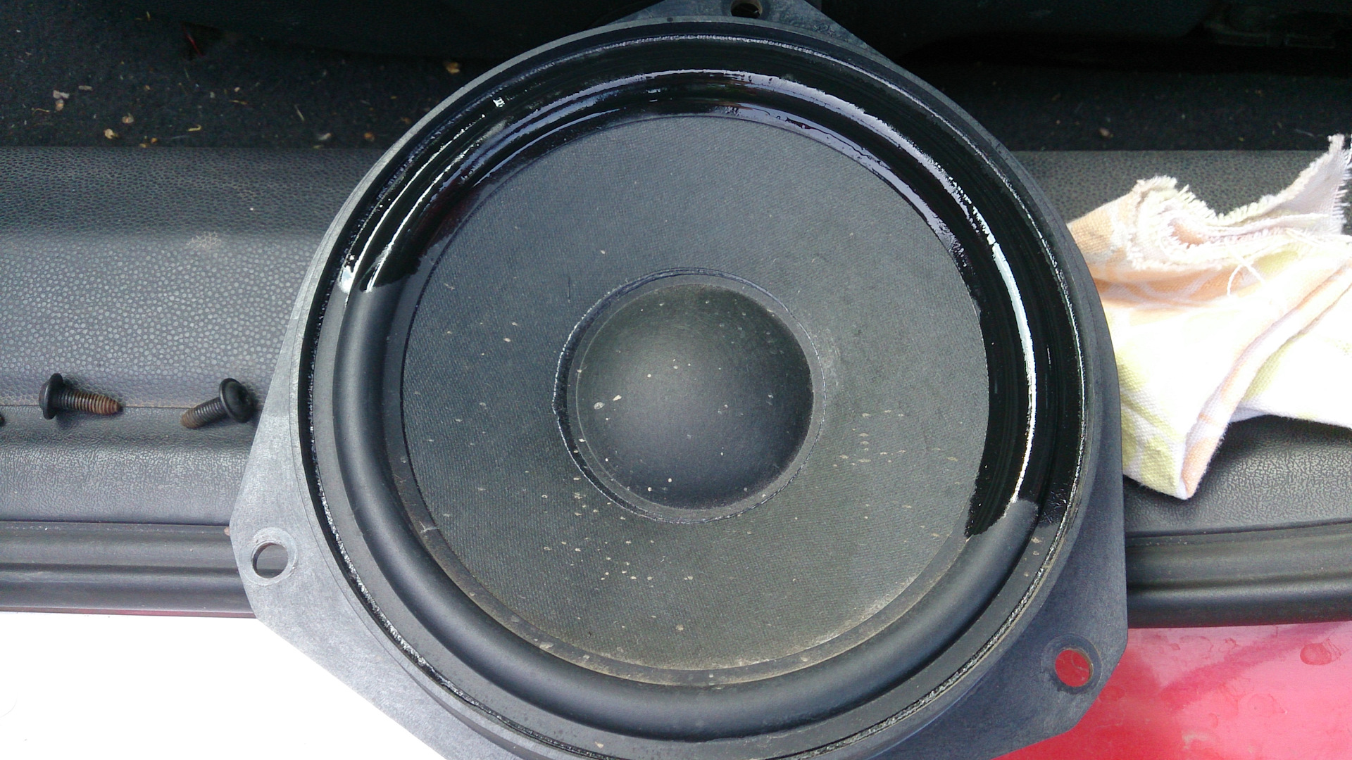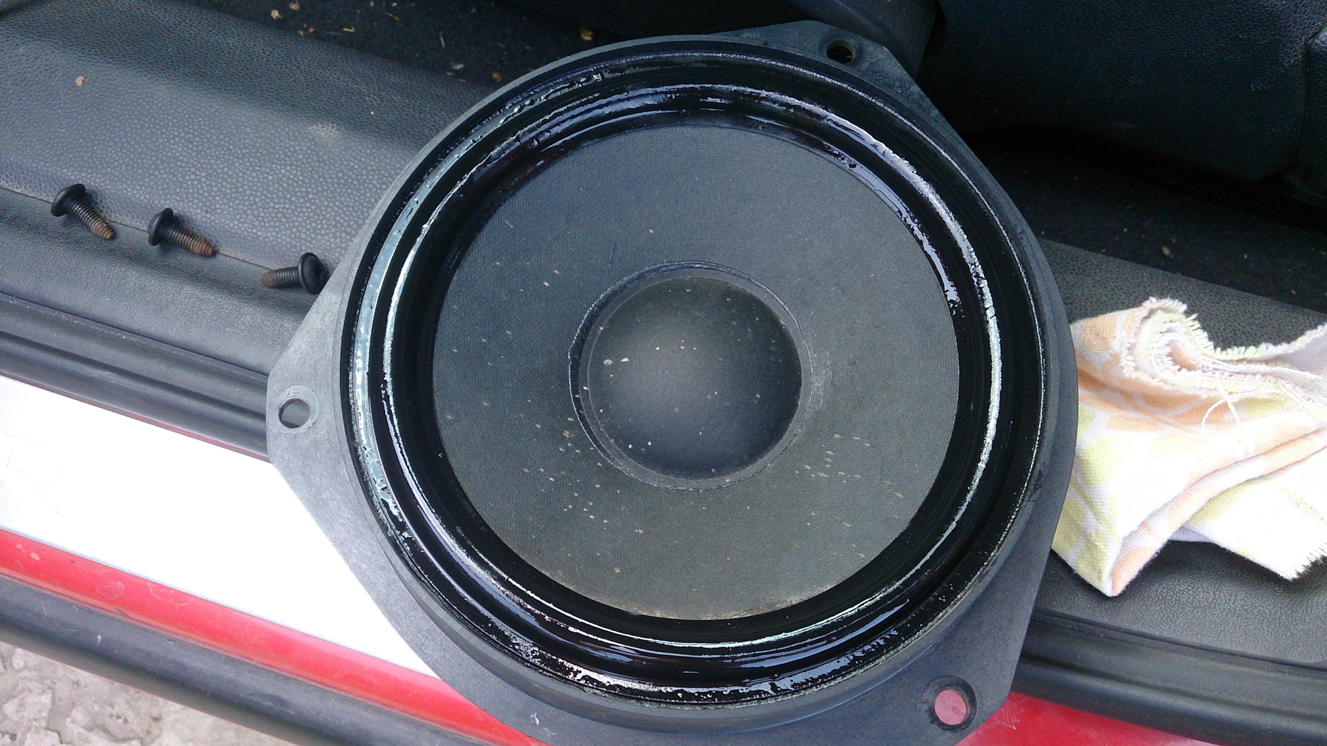 Ну и раз уж обшивки сняты — решил проверить на собственном опыте один интересный эксперимент. А именно — обработать динамики реставратором покрышек.