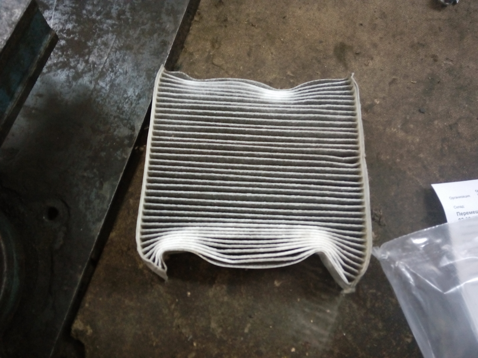 В общем погнали менять расходники. Первое, что мне сделали, так это заменили фильтра салона. Мастер улыбнувшись достал ЭТО из недр панели и бросил на стол. Как-то мне сразу не понравилась его ухмылка и вид мятого "квадратика" из фильтровочной бумаги. Спросив в чем дело у мастера, был получен ответ, что фильтр был установлен не правильно.
