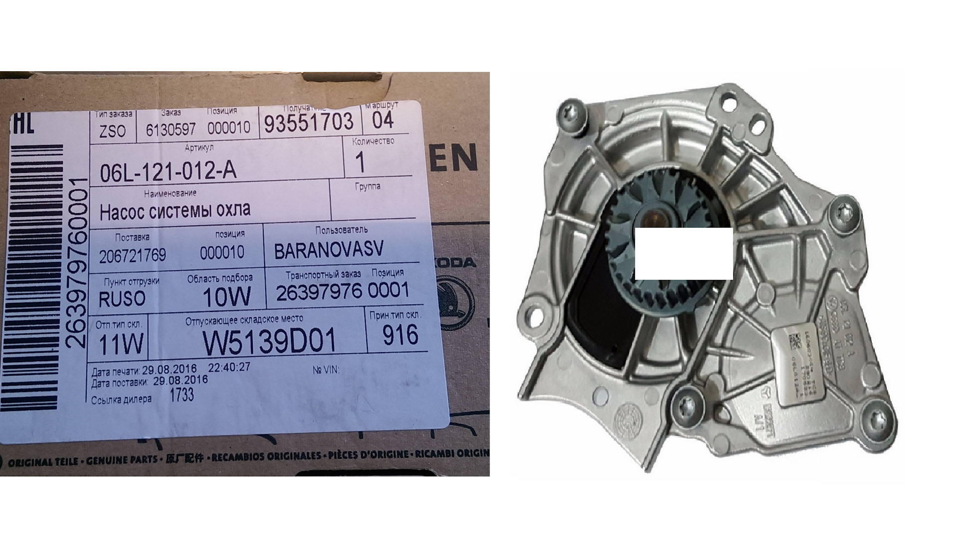 1) Насос системы охлаждения последней ревизии 06L121012A 1шт. идет в комплекте с уплотнительной резинкой (до этого у меня стоял насос 06L121005A, как оказалось он с браком)