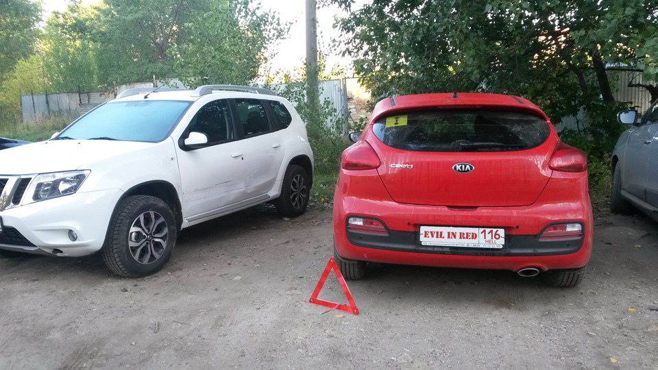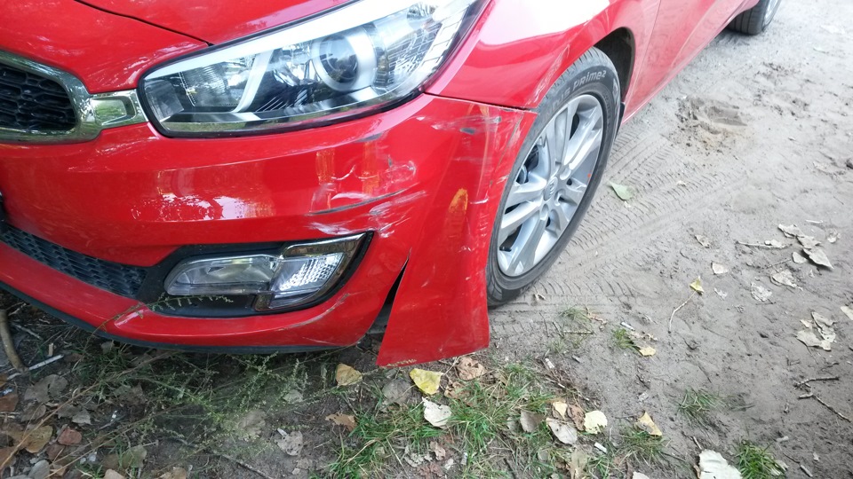 После работы вечером оставил машину ночевать, на своем обычном месте во дворе. На следующий день, завершил все утренние процедуры (помылся, подмылся, побрился, заточил яичницу). Зарядку делать не стал, т.к. в нашей семье зарядкой по утрам занимается только сотовый телефон. :) Одеваюсь, значит, чтобы идти на работу и вдруг звонок соседа: "Выходи скорее, тут твою машину разбили". Сердце сжалось. Смотрю в окно, Ниссанчик стоит на месте, рядом припаркован красный ceed. Бегом в низ, а там…