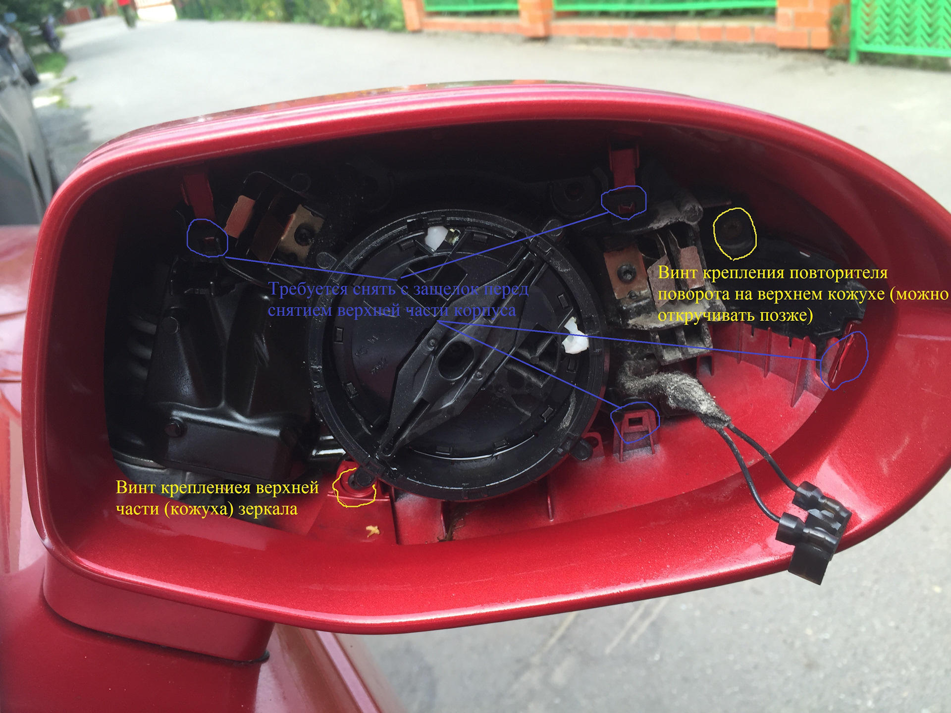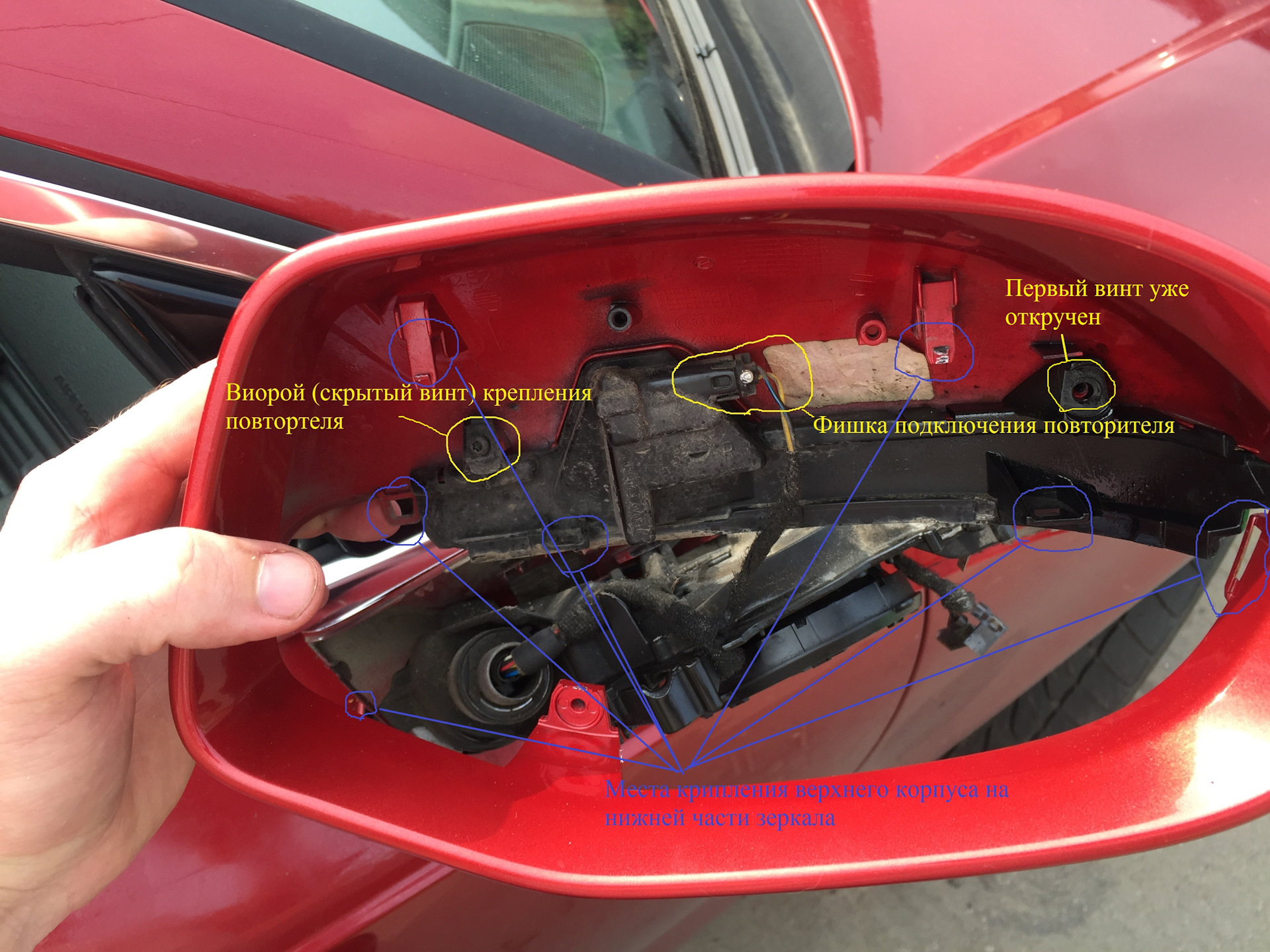 Но на этом началось самое интересное, были откручены два винта находящихся за зеркальным элементом и предприняты попытки снять верхний кожух с защелок, было страшно их сломать. По тому как образовывались щели между верхней и нижней части кожуха были определены места нахождений данных защелок и затем простым усилием тяги вверх и выкручиванием верхний корпус зеркала, с закрепленным на нем повторителем с них был снят. Также требуется разъединить клемму фиксирующаяся в повторителе поворота, аккуратно с помощью тоненькой отвертки.