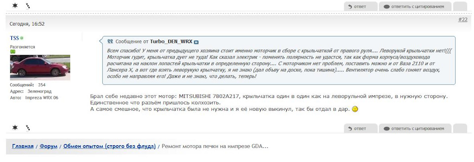 И тут очередной лайфхак: хотя уже многие это знают, что моторчик на субару импрезы 00-07 годов это практически точная копия моторчика от митсубиси лансер Х (ну и еще каких то моделей) 7802A217, вся разница лишь в расположении клемм, но это решается двумя клеммами и кусочком провода за 10 мин и вы получаете абсолютно Новый! заводской мотор за 3600 руб (сейчас уже ~4200 руб), хотя некоторые по прежнему покупают б/у-шные моторы или что то там колхозят с моторами от десятки.