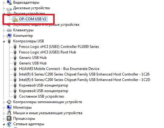 После того, как FTDI будет запрограммирована то прибор необходимо отключить от USB-порта, отключить интернет так как может автоматом искать в нем дрова (а может и не искать, когда как) и подсунуть опять тот же не нужный нам драйвер, а затем подсоединить вновь.И мы уже видим что к компьютеру подключено не неизвестное устройство а прибор OP-COM