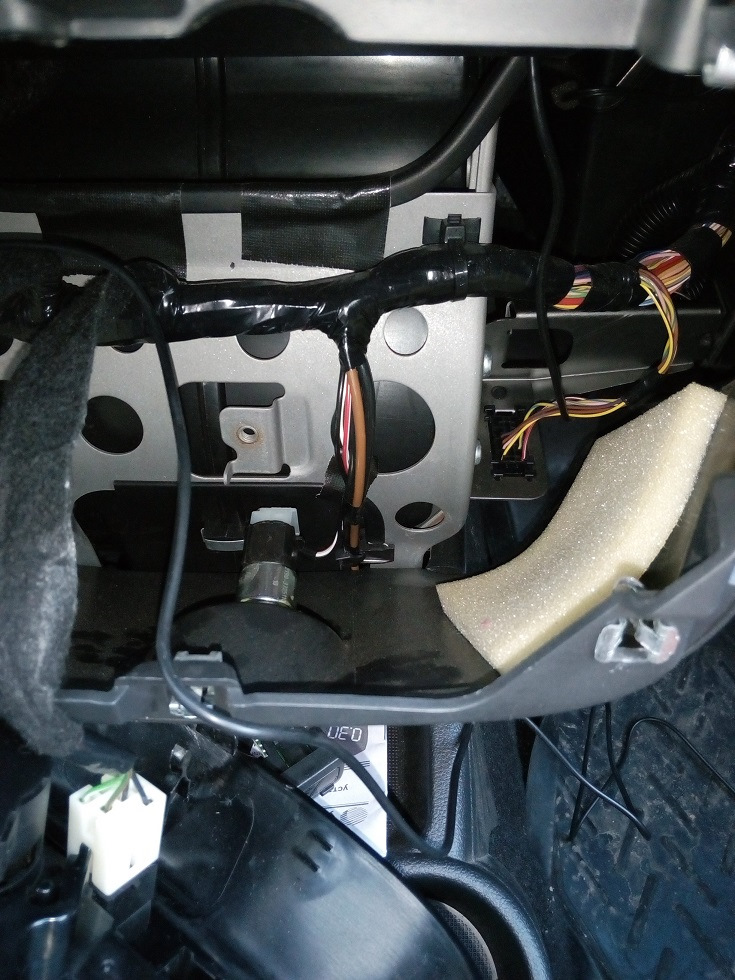Провода провёл с передней камеры и GPS приёмника под потолком. с задней камеры вдоль верхней части резиновых уплотнителей сверху дверей. Кабель питания поднял по левой стойке, предварительно её сняв. В первый раз долго снимал панель отопительной системы. Боялся сломать, поцарапать, кое как подцепился и потихоньку силой снял. Места там за прикуривателем полно …