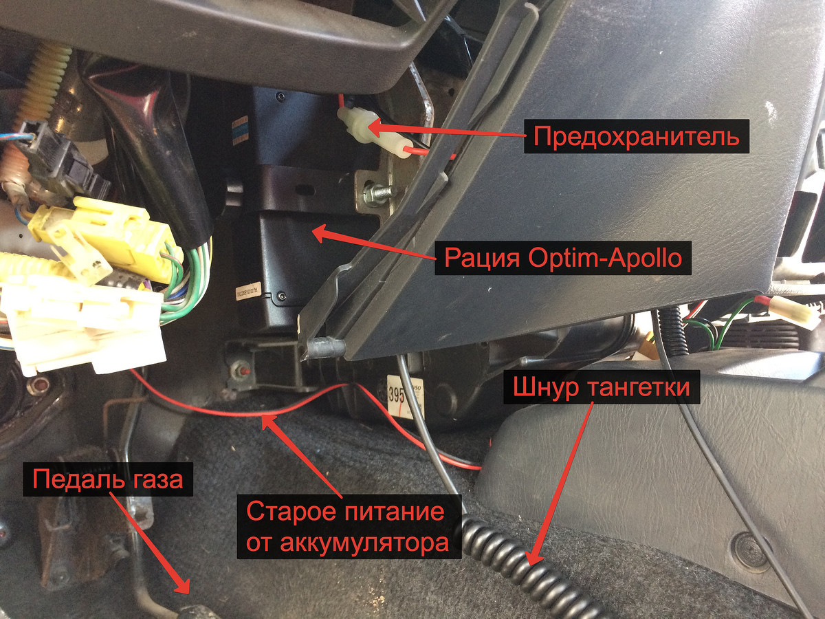 Пару дней провозился с определением куда пихать базовый блок. В итоге сегодня, основательно постояв на коленях и вытащив бардачок, магнитолу и подрулевую панель, нашел место для крепления. Под рулем, правее есть удобная металлическая перекладина. По умолчанию на неё крепится родная антенна (которую я заменил на активную) и еще пара черных проводов с минусом. Клипсы проводов и антенны я отщелкнул, а провода развернул на 180 градусов.
