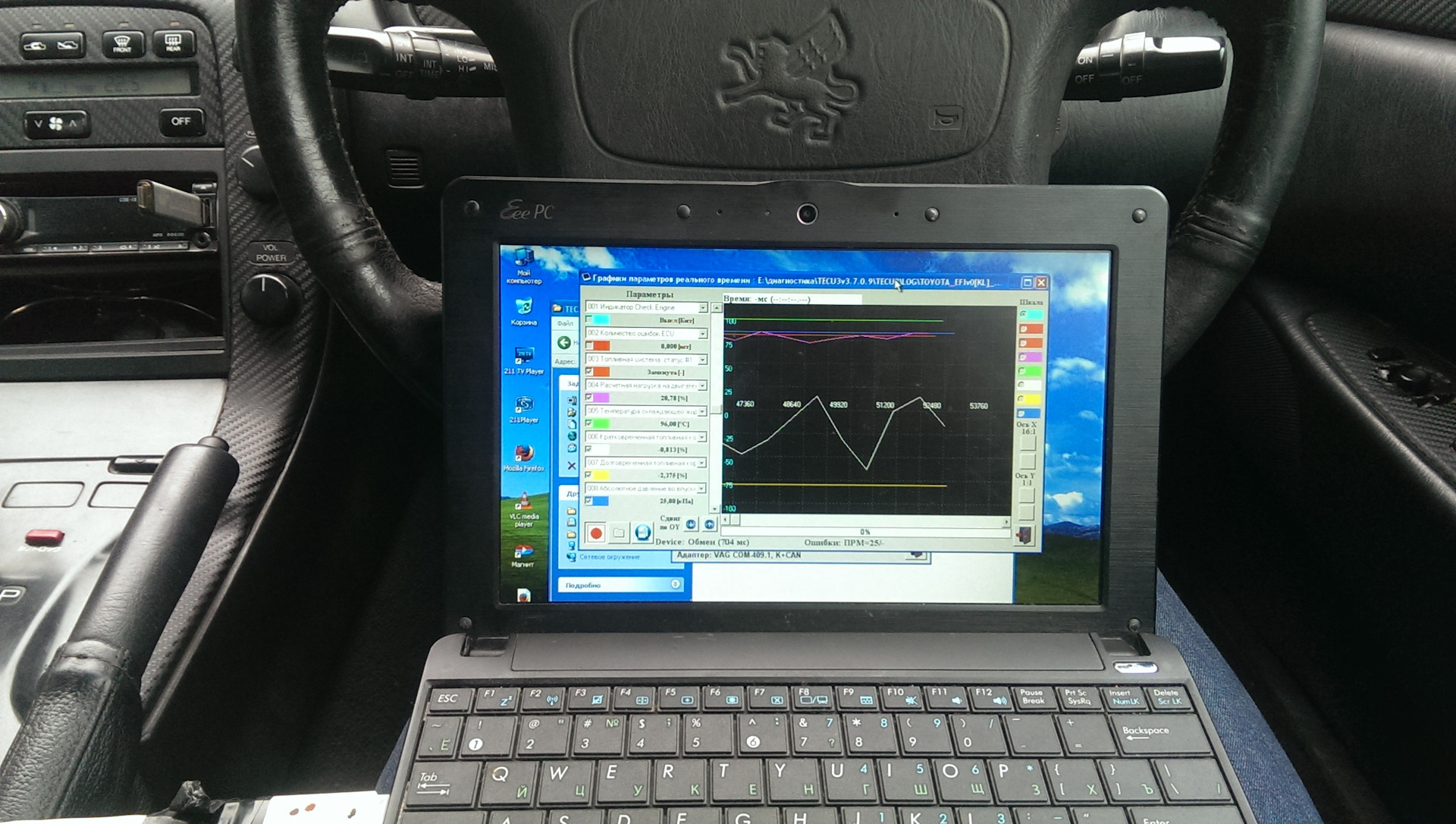 Прога TECU 3 для Windows отлично тянет данные (правда период обновления данных на моем адаптере был не выше 0,7 с). Справка к приложению довольно подробная, единственный комментарий от меня: для начала соединения нужно нажать «информация о ECU» во вкладке «окна» или просто ctrl+I. И что же имеем на выходе? Ошибок нет, лямбда работает, датчики температуры и скорости тоже, угол опережения зажигания меняется.