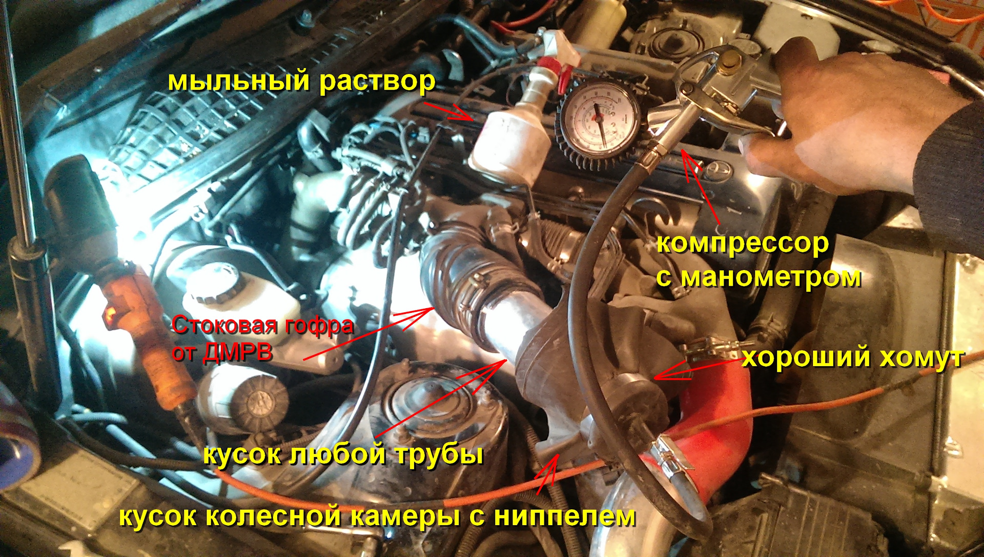 Ну так о чем я? Таким способом можно проверить не только герметичность, но и протестить впускную трассу на повышенное давление, от которого иногда слетают хомуты силиконовых труб кулька.