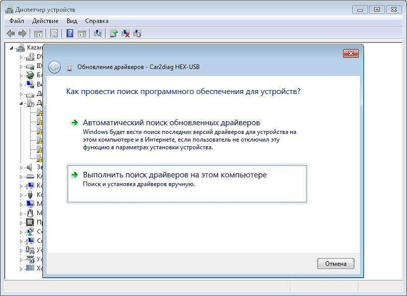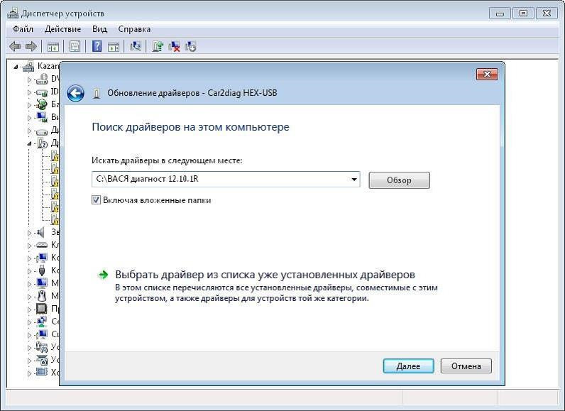 — "Выполнить поиск драйверов на этом компьютере" и указываем путь к папке, куда ранее была установлена программа "ВАСЯ диагност"