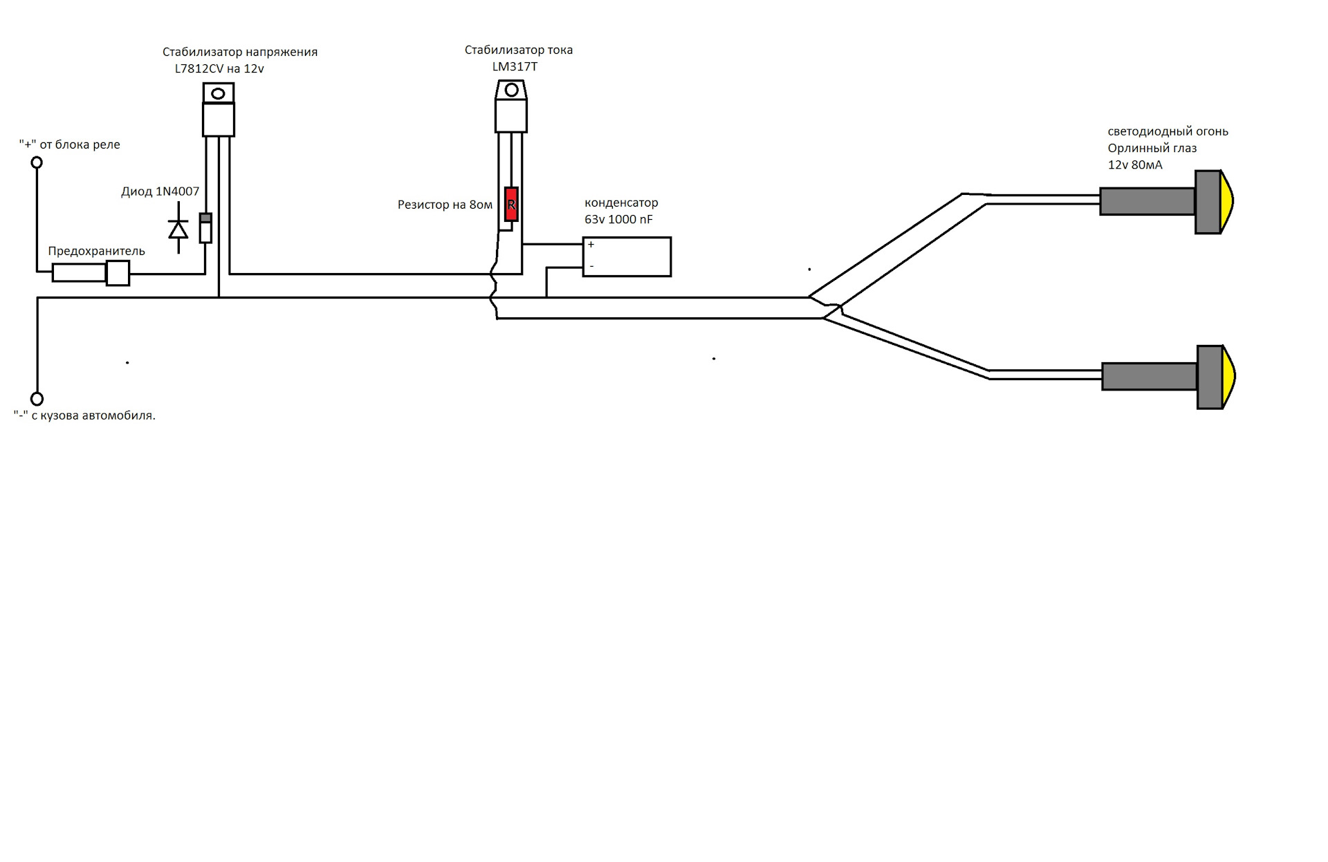Многие при установке огней просто собирают стабилизатор тока и подключают к нему огни, или ставят на каждый огонь по стабилизатору тока, при этом на каждом стабилизаторе выходной ток регулируется резистором, для этого изначально измеряют потребление тока светодиодом.