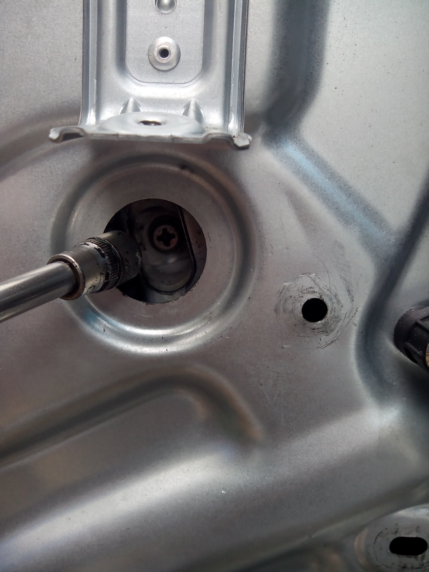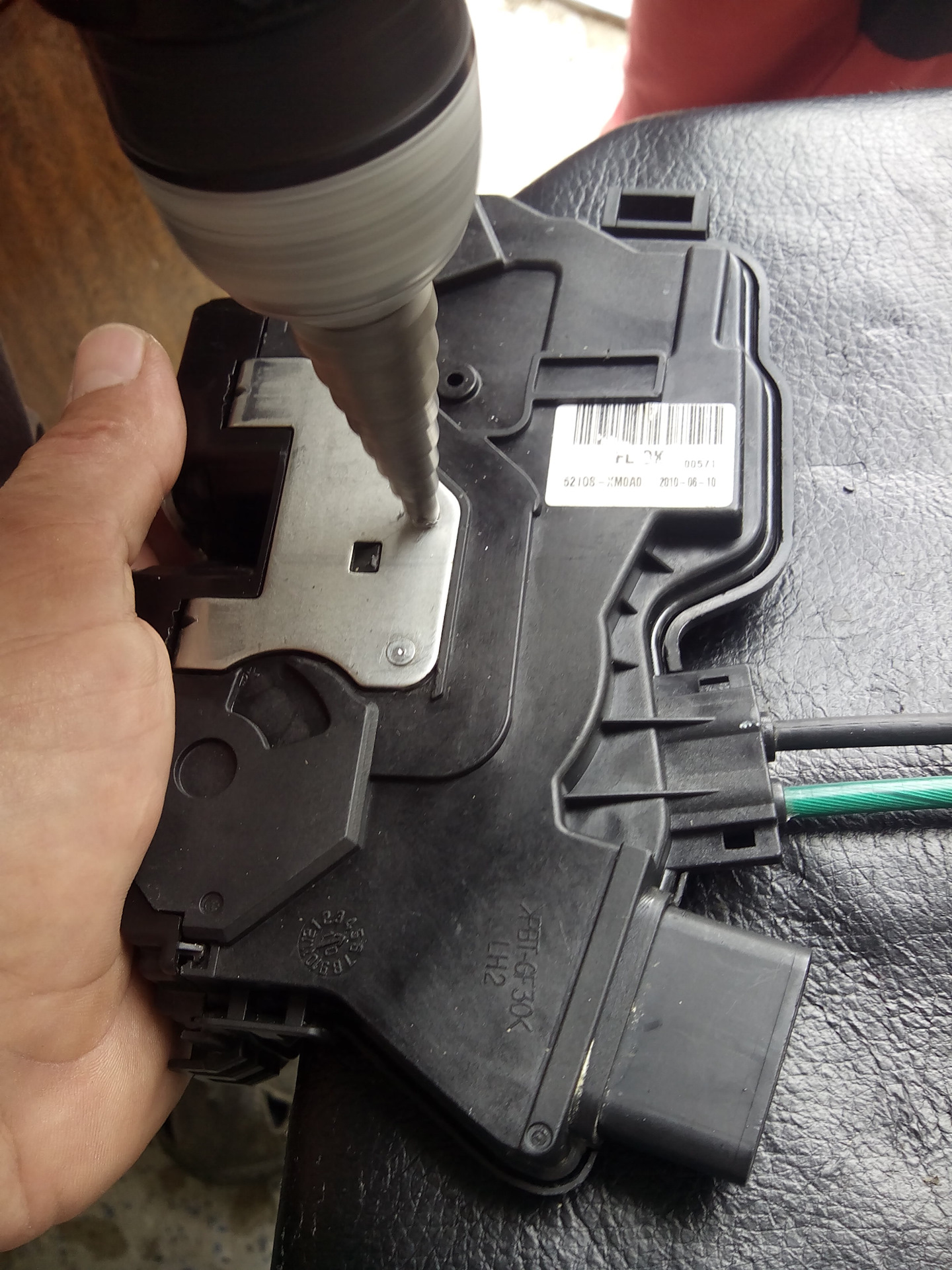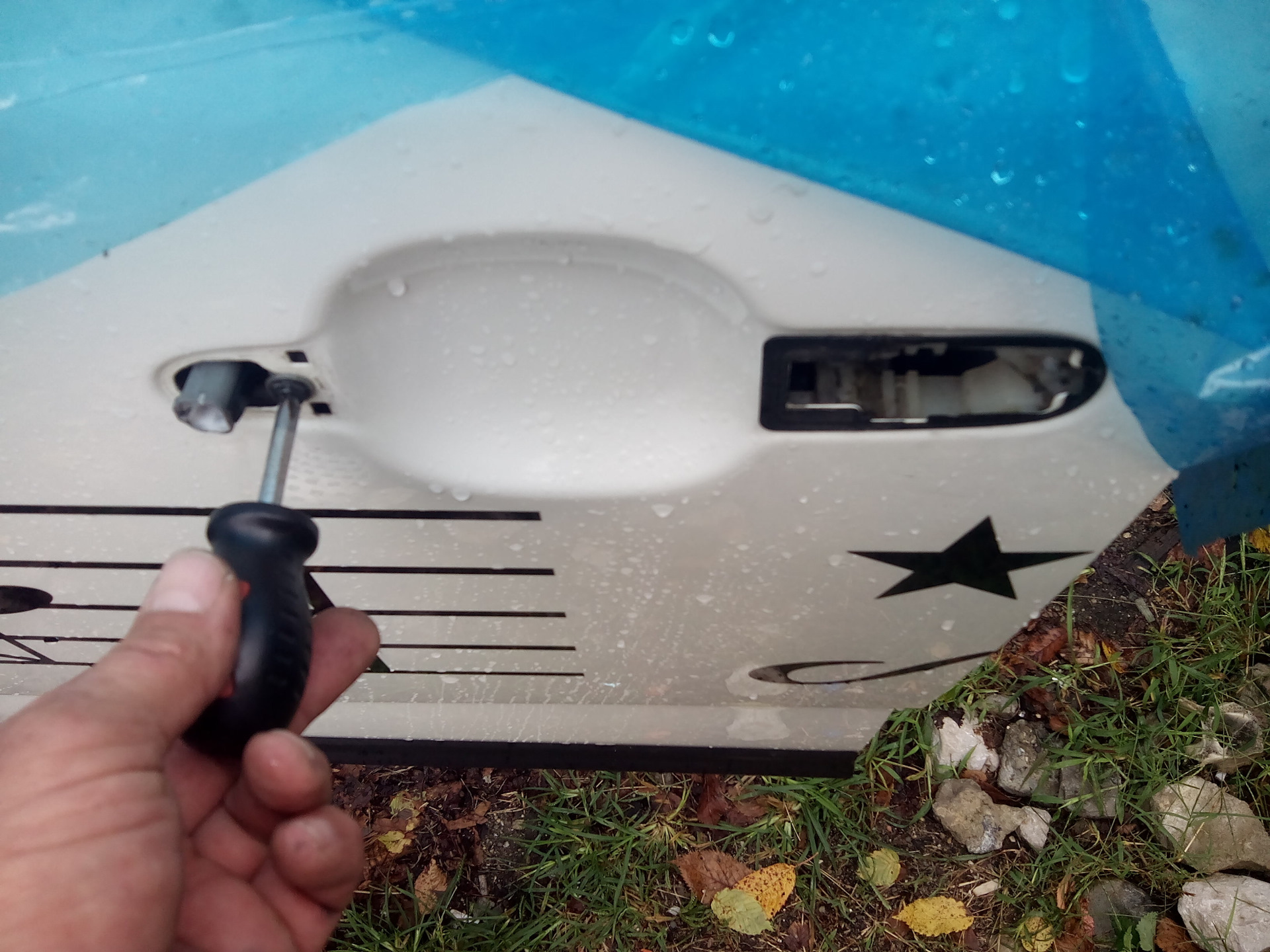 Снимаем накладку дверей и откручиваем металлическую карту, не забываем отсоединить все электро штекерывытаскиваем две резиновые заглушки и большой фигурной отверткой ослабляем болты, чтобы освободить стекло и поднять его до конца вверх, застопорить иначе не вытащить дверной механизм который крепиться на дверной картеоткручиваем болт до конца, отгибаем усики и как можно ближе выдвигаем на себя, иначе часть дверной ручки не снятьпосле того как открутили болт с боку двери снимаем часть ручки просто тянем на себязвездочкой откручиваем сам дверной замокостальную часть ручку тянем в право слегка и она выходит, у кого есть отсоединяйте электофишкуфигурной отверткой откручиваем винт, готово к снятиюеще раз повторюсь замок приклепан к дверной карте и снимается только заоднопосле того как сняли дверную карту с замком его можно отсоединить с защелок которые не заклепанызамок отдельно переходной пластик отдельноМеханизм закрывания-открывания…ЛОМАЕМ)))откручиваем 4 винтаоси заклепки пришлось высверливать но не полностью, оставить с таким расчетом чтобы можно было заклепать обратноСнимаем крышку и видим что ПРУЖИНКА СЛОМАНА…и не отбрасывает пластину, соответственно не открывается дверьвот из-за этой маленькой сломаной пружины я мучался…решение очень простое РАЗГИБАЕМ ОДИН ВИТОК ПРУЖИНЫ И СТАВИМ НА МЕСТОПружина на месте и все работает, собираем…ДОГАДАЙТЕСЬ ДЛЯ ЧЕГО Я ЭТО ДЕЛАЮ?..собираем все в обратной последовательности…