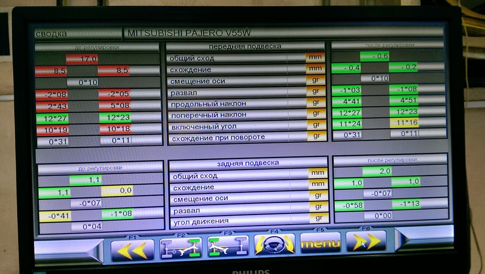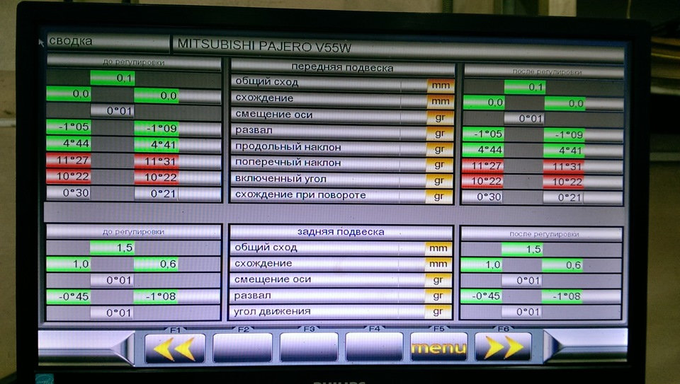 Проехал примерно 10 км, заглянул к ним ещё раз, с мыслью, а давайте проверим ещё раз, как там углы поживают. Проверили, оказалось, что все регулируемые показания в норме (в зелёной зоне) А вот, как мне сказали, что нерегулируемые, — это поперечный наклон и включенный угол, изменились, ушли в красную зону, хз почему, резина в сайлентах подсела? Содрали с меня за диагностику ещё 400 руб.