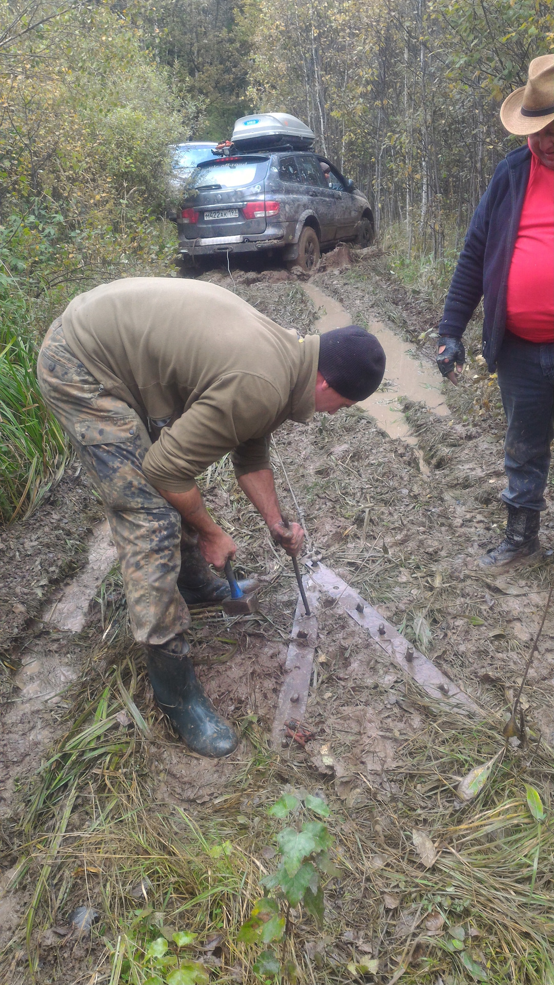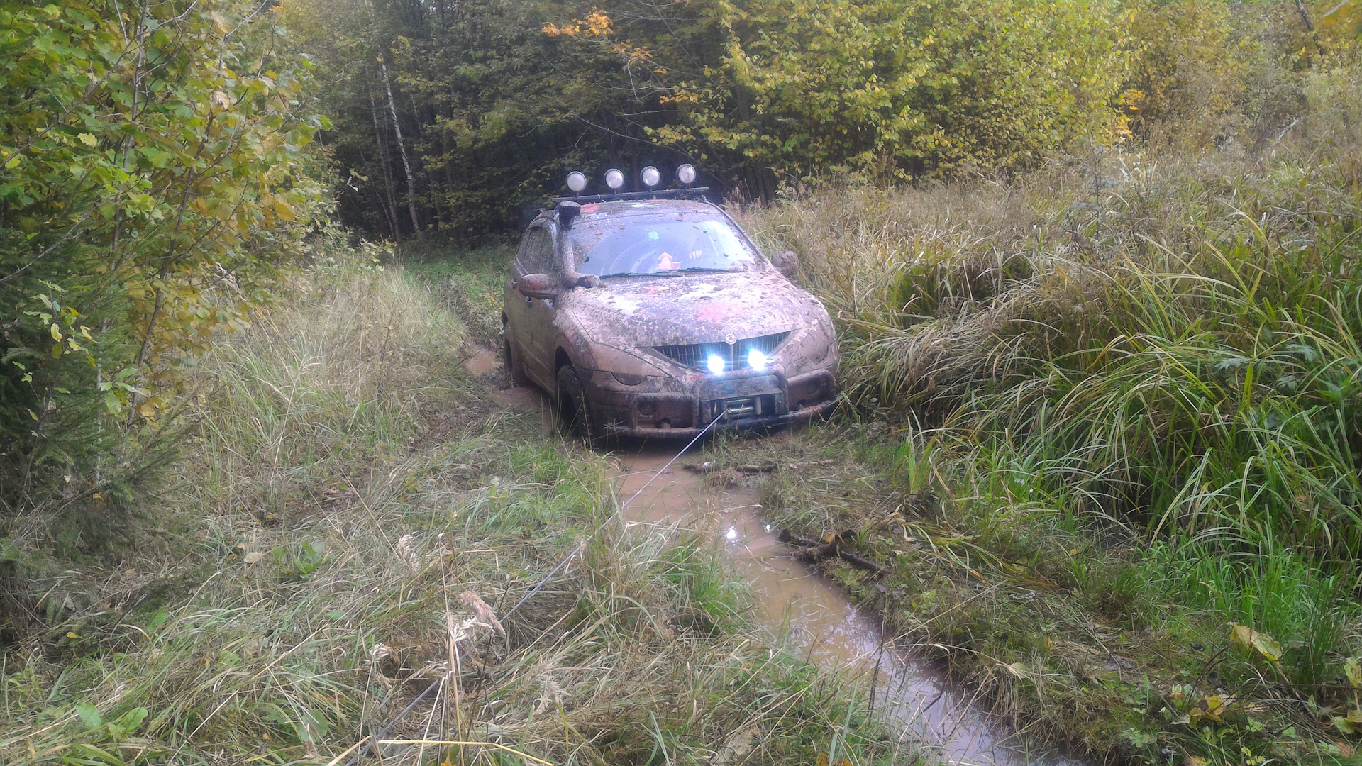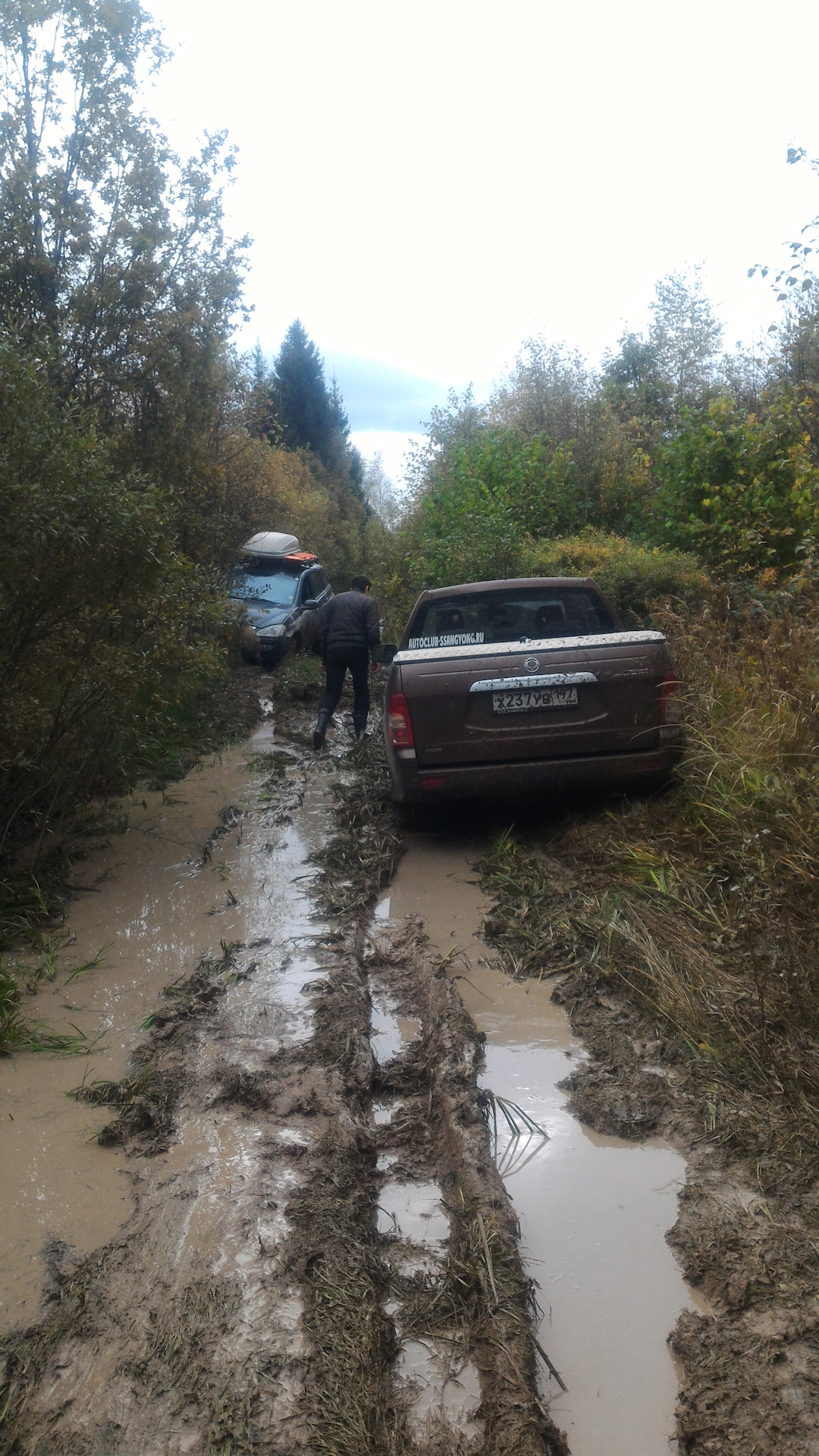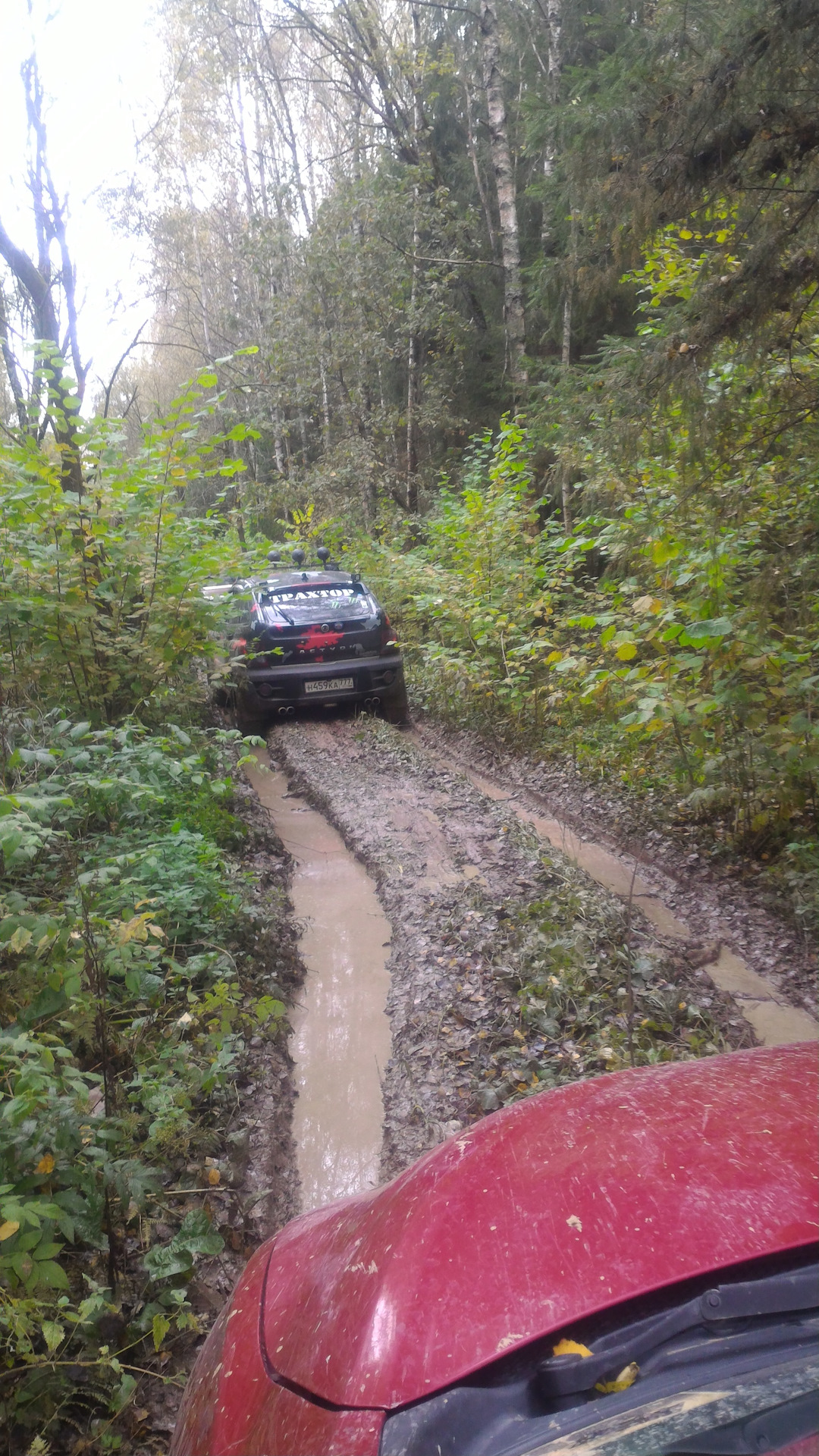 От поляны с перекусом начинается колейка, на которой начинает подзастревать Андрей на машине-доме, Эд кое где помогает ему проехать — тем самым расчищая нам дорогу. Потихонечку так и едем… Аркаша нигде не застревая везёт нас по лужам, болоту и прочей грязи.