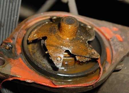 От кавитации также страдает крыльчатка помпы, причем и в грузовых, и в легковых автомобилях. Здесь кавитация (образование и схлопывание пузырьков) возникает на концах лопастей крыльчатки за счет уменьшения давления при повышении скорости. Эти пузырьки «съедают» края лопастей, а в предельном случае крыльчатку целиком. Приходится заменять помпу.