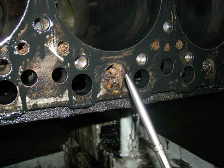 Коррозия. Наиболее частым дефектом, связанным с охлаждающей жидкостью, является коррозия металлов, с которыми эта жидкость контактирует. Коррозионный слой (ржавчина) на стенках каналов двигателя и радиатора становится изолятором тепла, так как имеет теплопроводность примерно в 50 раз меньшую, чем металл. Возникает следующая причинно-следственная связь: двигатель хуже отдает тепло, радиатор хуже его принимает, двигатель перегревается, охлаждающая жидкость перегревается, отвод тепловой энергии будет происходить при повышенных температурах. Проблема усугубляется тем, что коррозионный слой сужает каналы радиатора (которые и без того узкие) и увеличивает гидравлическое сопротивление каналов (гладкая прежде поверхность становится шершавой). Это ведет к уменьшению скорости движения охлаждающей жидкости, снижению теплоотвода и дополнительному перегреву. Из-за продуктов коррозии (частиц ржавчины), находящихся в охлаждающей жидкости может «заклинить» термостат, разрушиться крыльчатка помпы, протечь (разгерметизироваться) подшипник помпы, засориться радиатор и даже каналы двигателя. В предельном случае «запущенная» коррозия может «съесть» радиатор до дыр, или головку блока цилиндров.