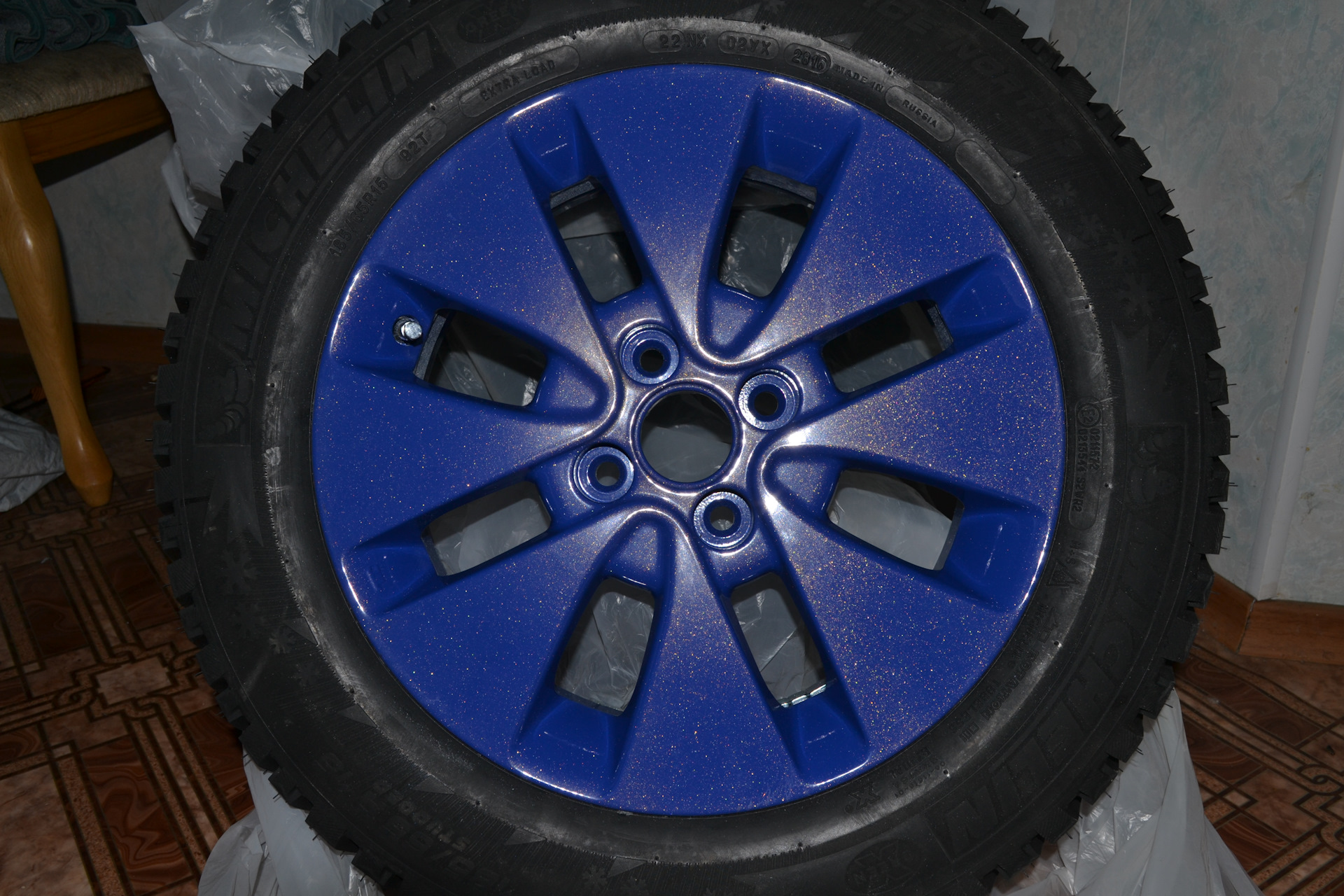 И тут уже смешанные чувства: с одной стороны у меня есть 4 диска приобретенные по великолепной цене, с другой стороны на эти диски без слез не взглянеш. В итоге погуглив нашел у нас в городе фирму занимающуюся порошковой покраской и благополучно отдал туда диски. Цена за 4 диска 7 000 рублей, может быть и не дешево но получилось бомбезно – переливающийся синий цвет с алмазной крошкой под лаком выглядит суперски. Говнокамера на телефоне конечно не передает истинную красоту колесиков но поверьте в живую выглядит просто супер. Обещаю на зеркалку пофоткать как они будут на машине смотреться. Название и координаты фирмы где красил не указываю умышленно дабы не сочли за рекламу, если кому то интересно на все вопросы отвечу в лс.
