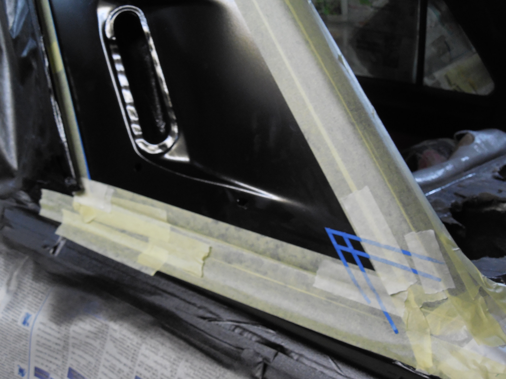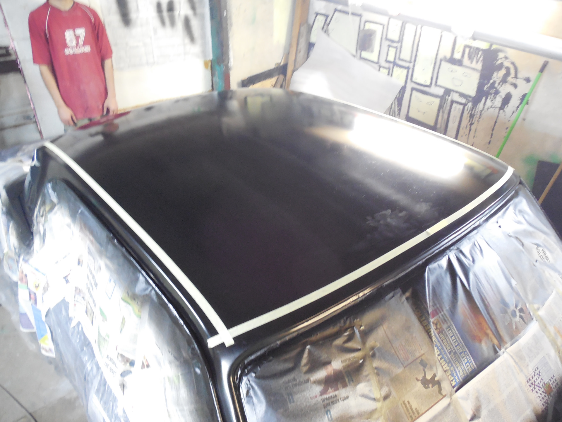 Вообщем в четверг машина была подготовлена, загрунтована и покрашена в черную базу. В пятницу (а это была пятница 13-го мая, что мы в свою очередь посчитали добрым знаком) с утра началось что-то по-настоящему творческое и интересное. Пока я ездил по магазам в поисках то ли филитриков для краски, то ли ещё какой-то мелочи…Егор и Андрей малярным скотчем уже обозначили границы будущих «цветочных отсеков».