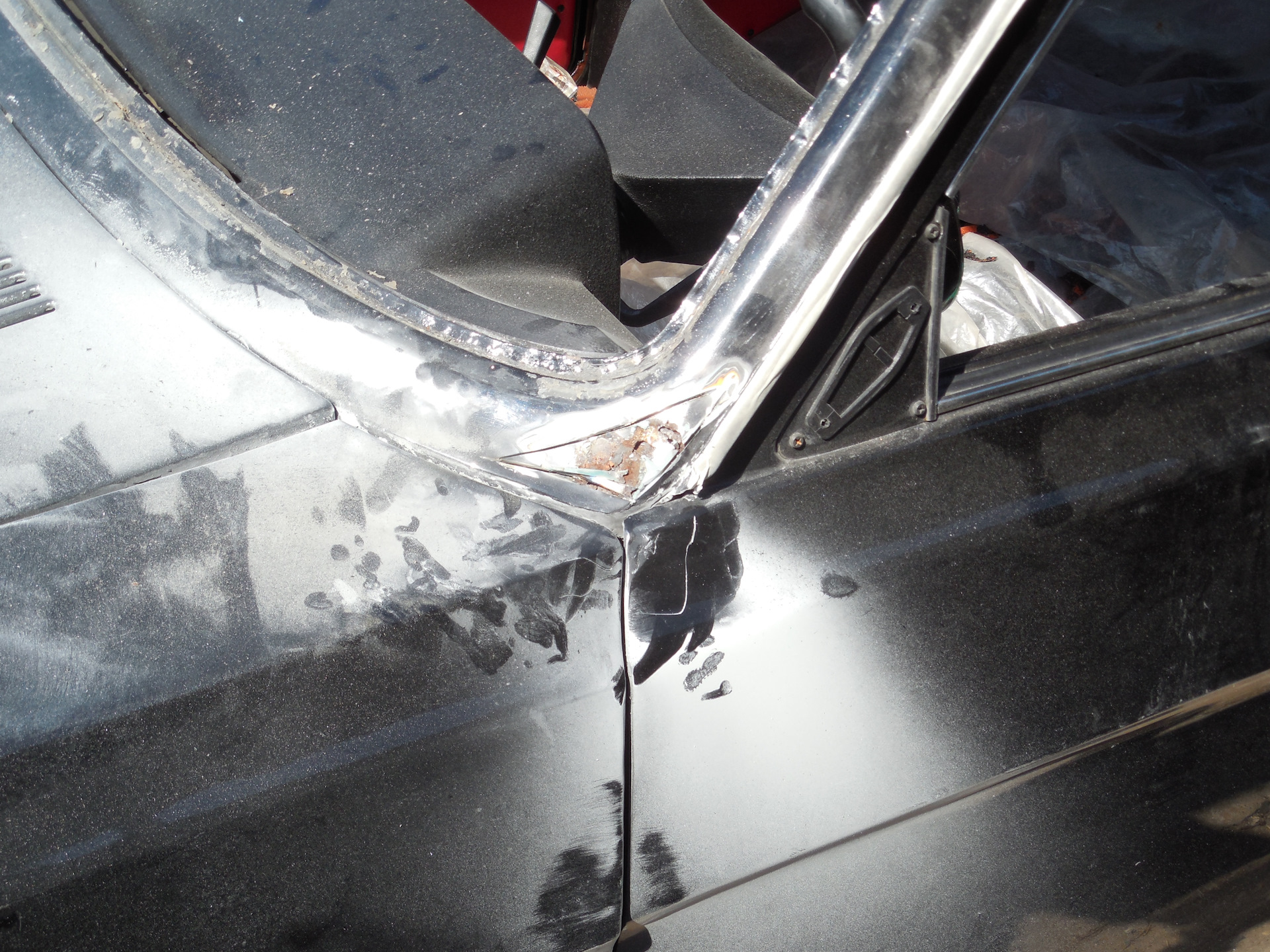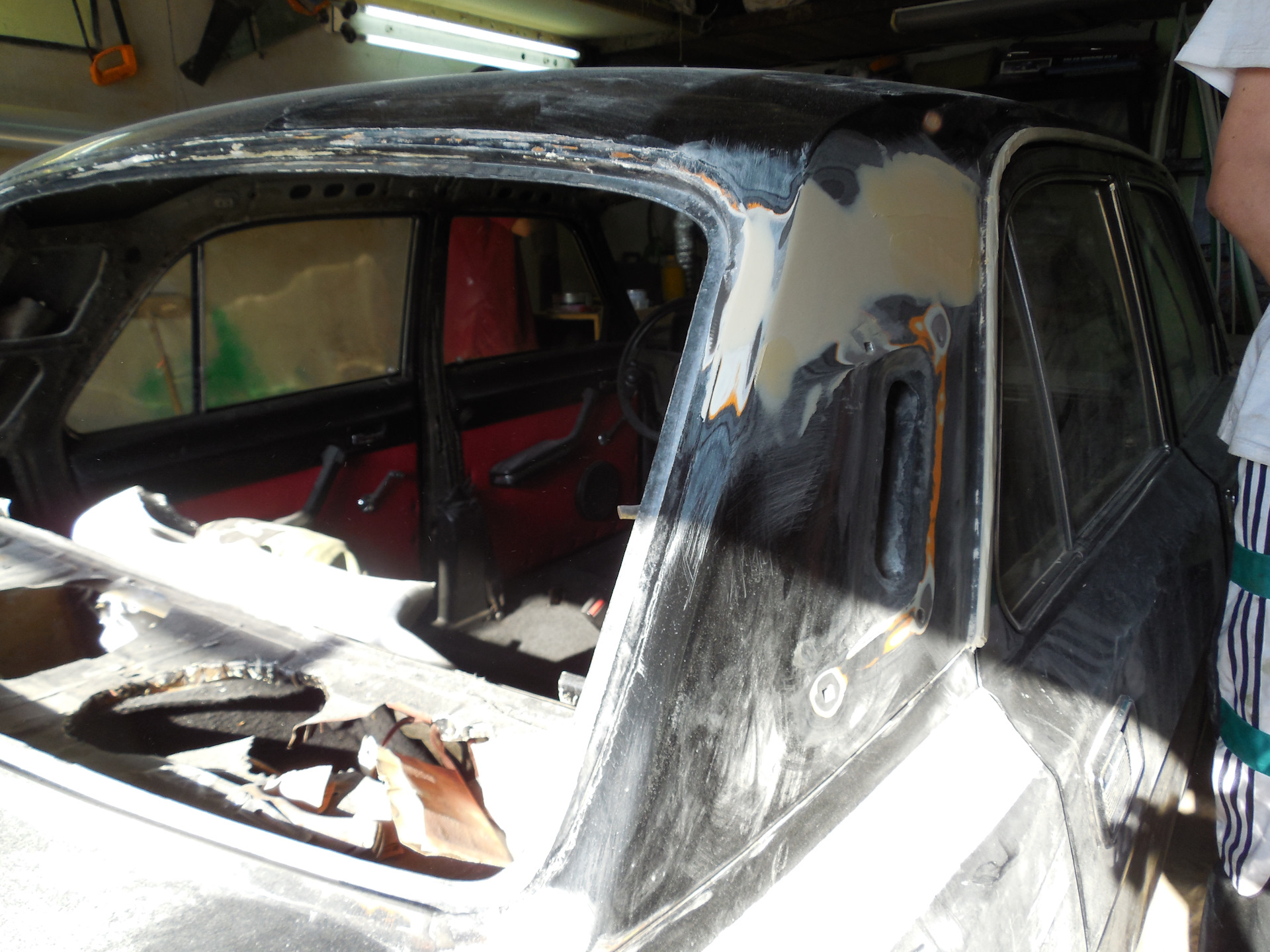 Некоторое время все действо ничем не отличалась от обычной малярки – чистили, матовали, обрабатывали.Поскольку это волга, то не обошлось без сюрпризов и неожиданностей – в нижней части ветрового стекла был найден не очень приятный артефакт, который прошлый маляр просто замазал шпаклей со стекловолокном.