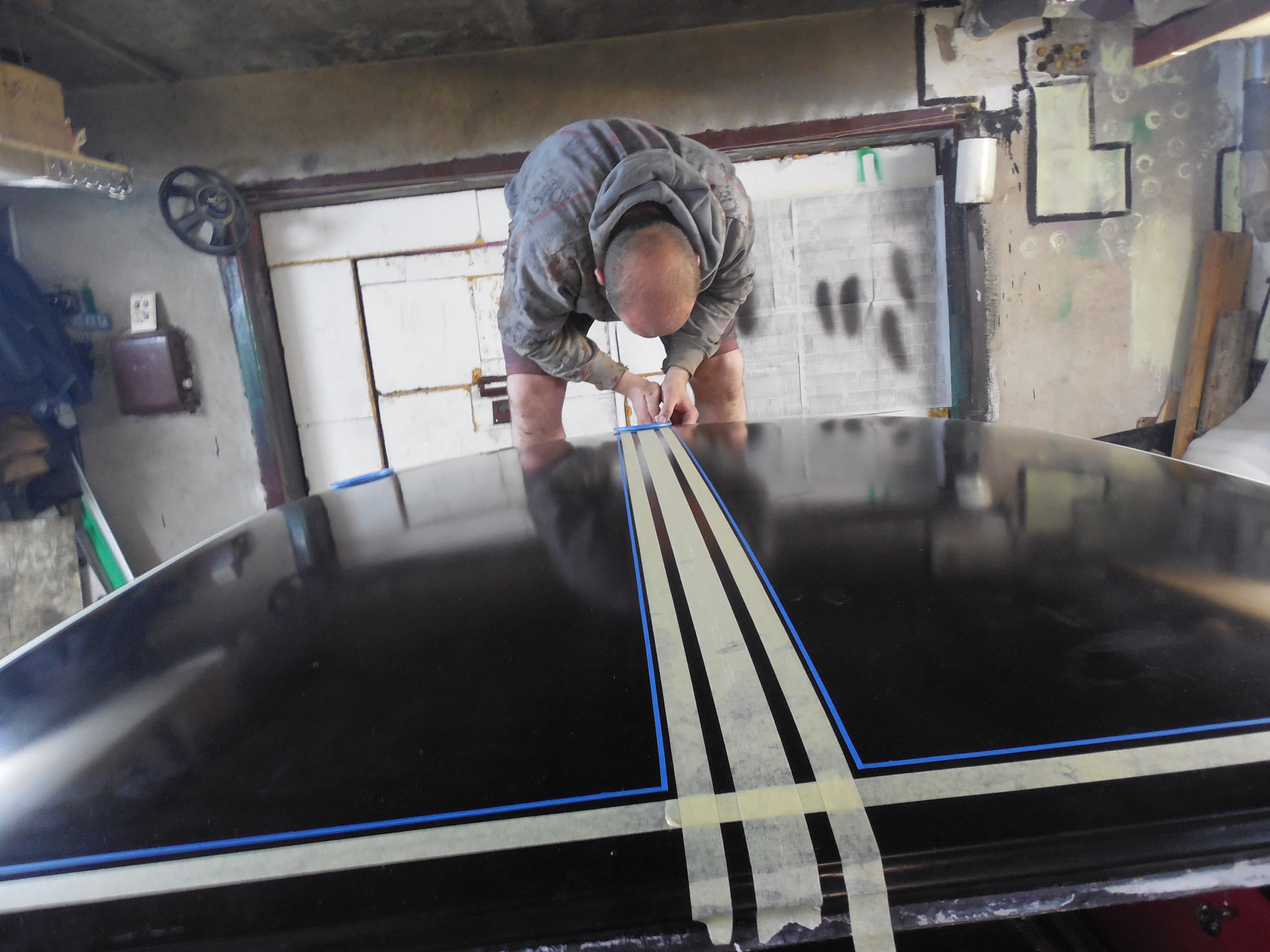 И это было чертовски клево, потому, что если Вам признаться честно я слабо представлял с чего нам начинать. Чем больше мы наклеивали малярной ленты тем более понятной и очевидной становилась схема покраски – все, что будет под малярной лентой – останется черным, все не накрыто станет красным. И понеслась – полоска ленты там, полоска ленты тут!