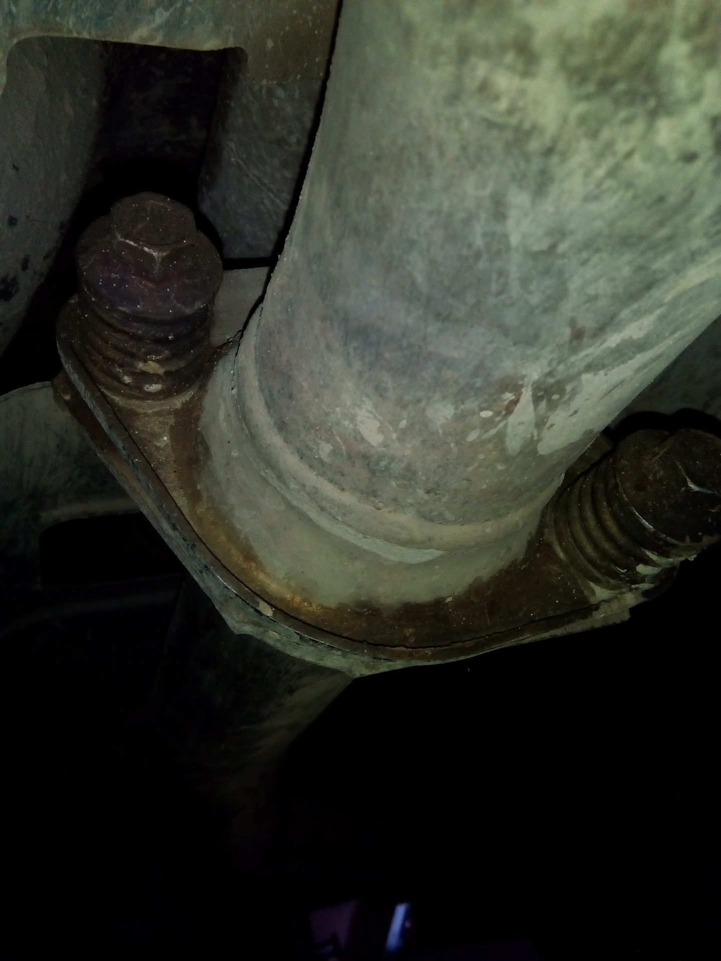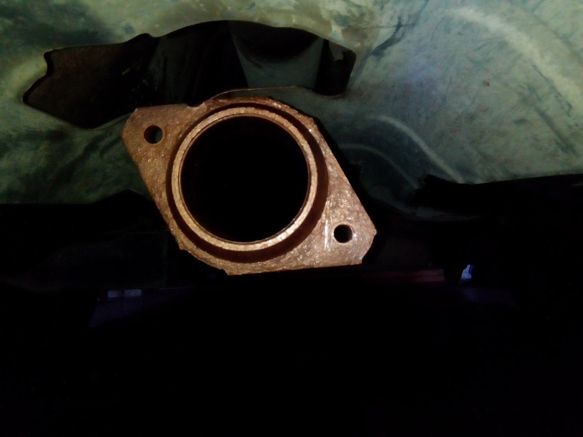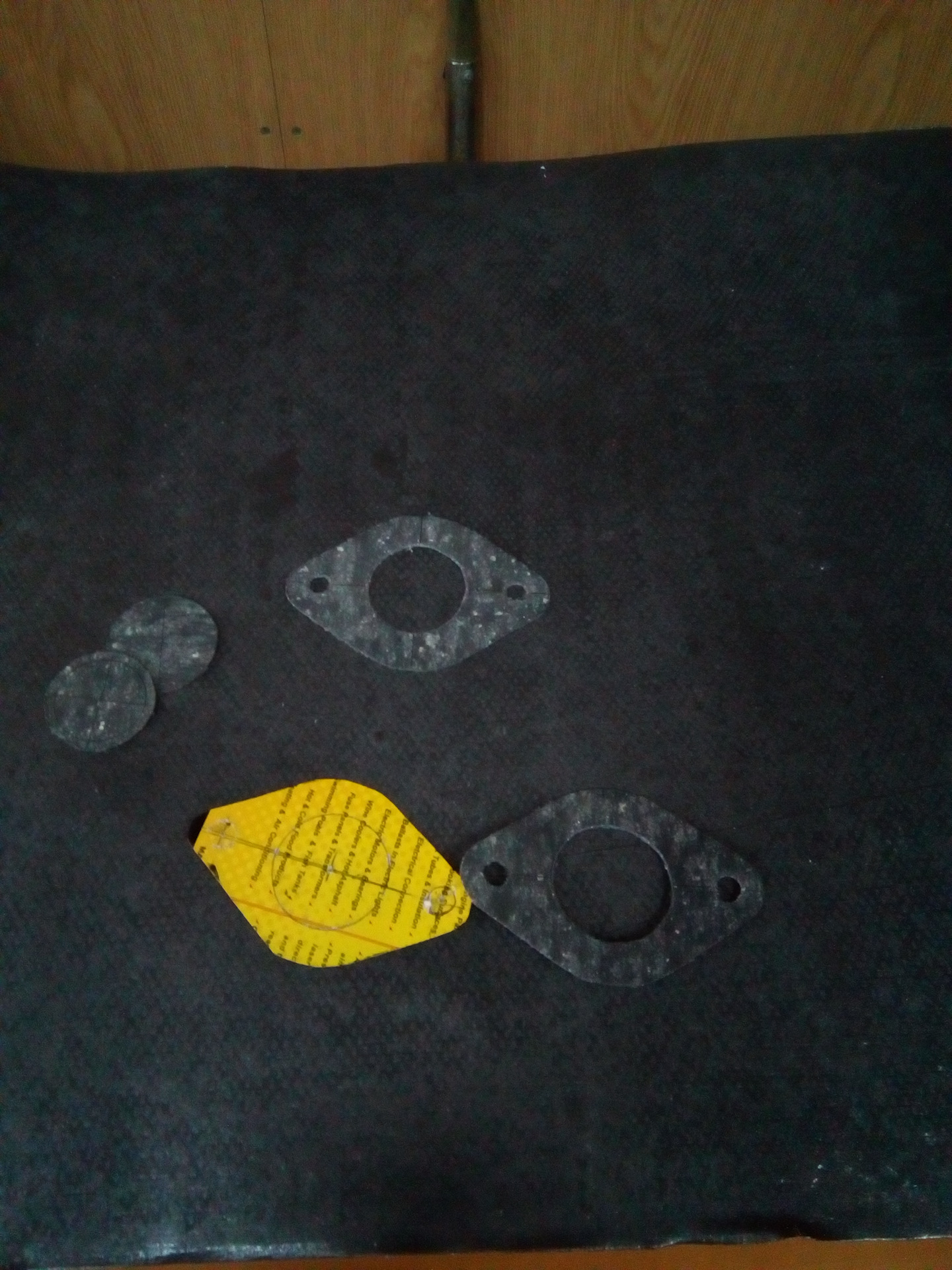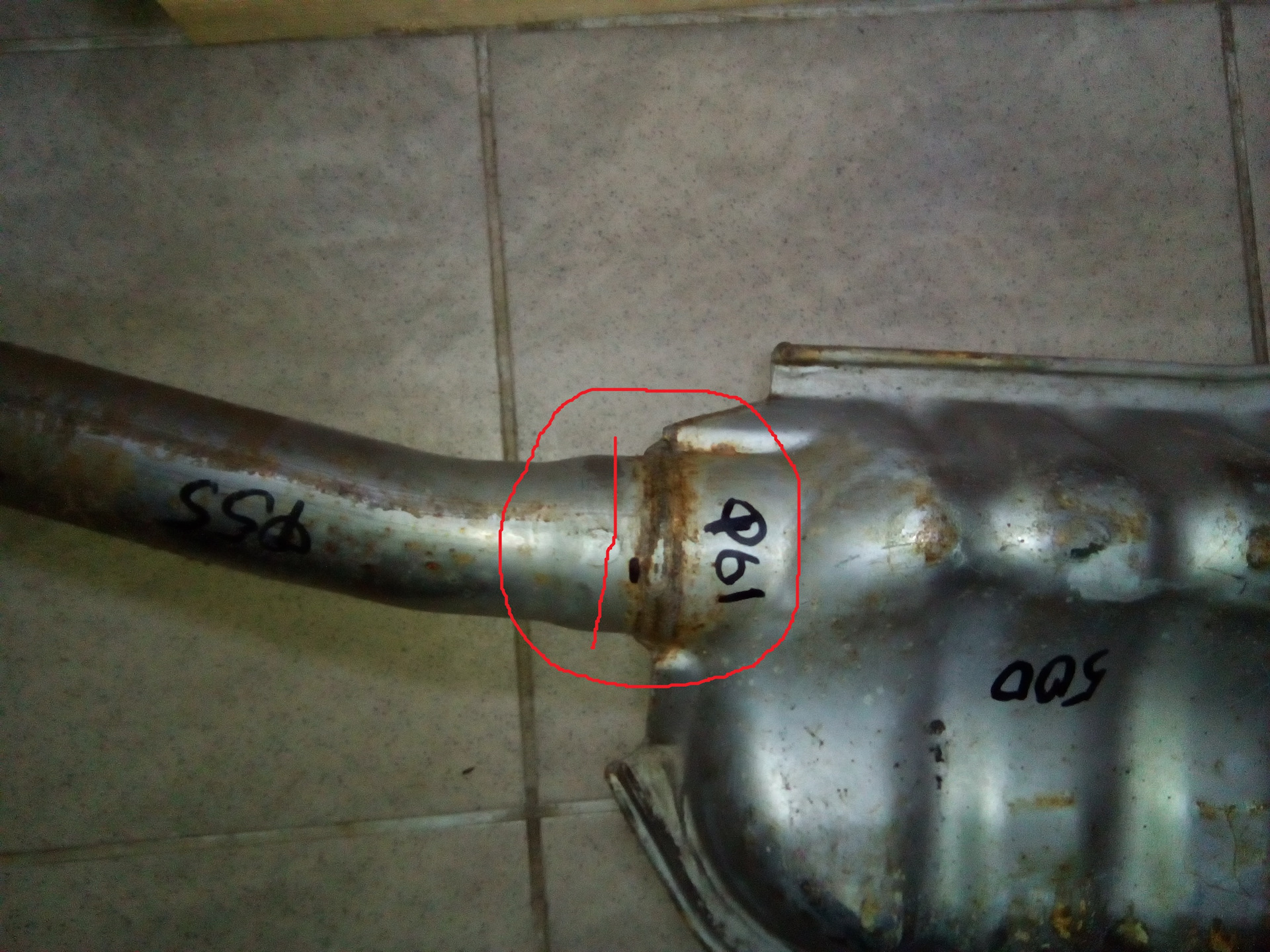 Вырубленные прокладки, для соединения банок с средней частью, из паронита не давали покоя, пришлось найти и приобрести листик металлоасбеста — 430р. и изготовить прокладки из этого материала.Отсоединил штатный выхлоп, собрал трассу воедино и подвесил для примерки.(((((Тюнинговая оказалась короче(((((. Снимаю и начинаю промерять, выяснилось, что необходимо удлинить на 25-30мм., но не меняя геометрии в плоскостях изгибов, т.е. на прямых участках до или после резонатора, я выбрал после резонатора, мне так удобней.Проставкой стал кусок трубы диаметром 61мм. и 30мм. длинной, дальше дело техники — зафиксировал глушитель, разрезал "болгаркой", интегрировал проставку, прихватил, проварил, почистил.Одному не с руки, поэтому сперва подвесил и наживил среднюю часть, а затем поочередно, в произвольной последовательности, через прокладки, медный спрей,