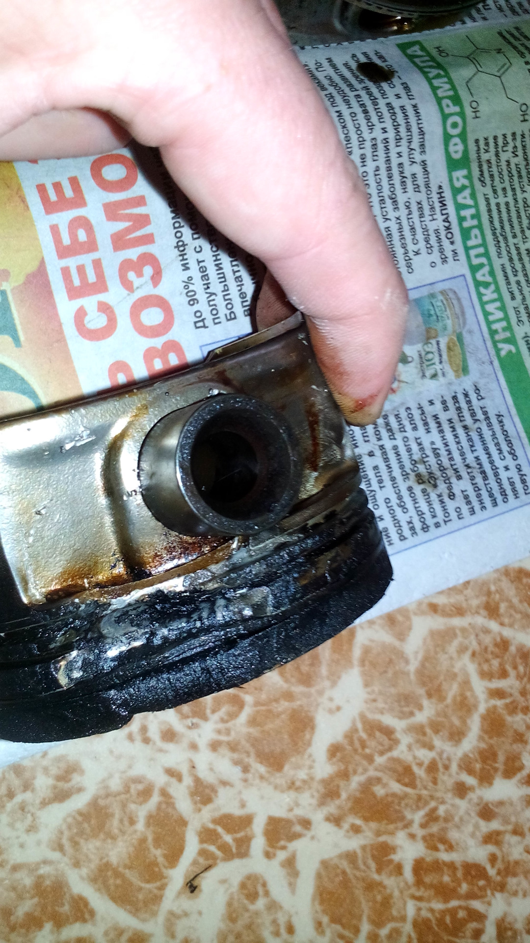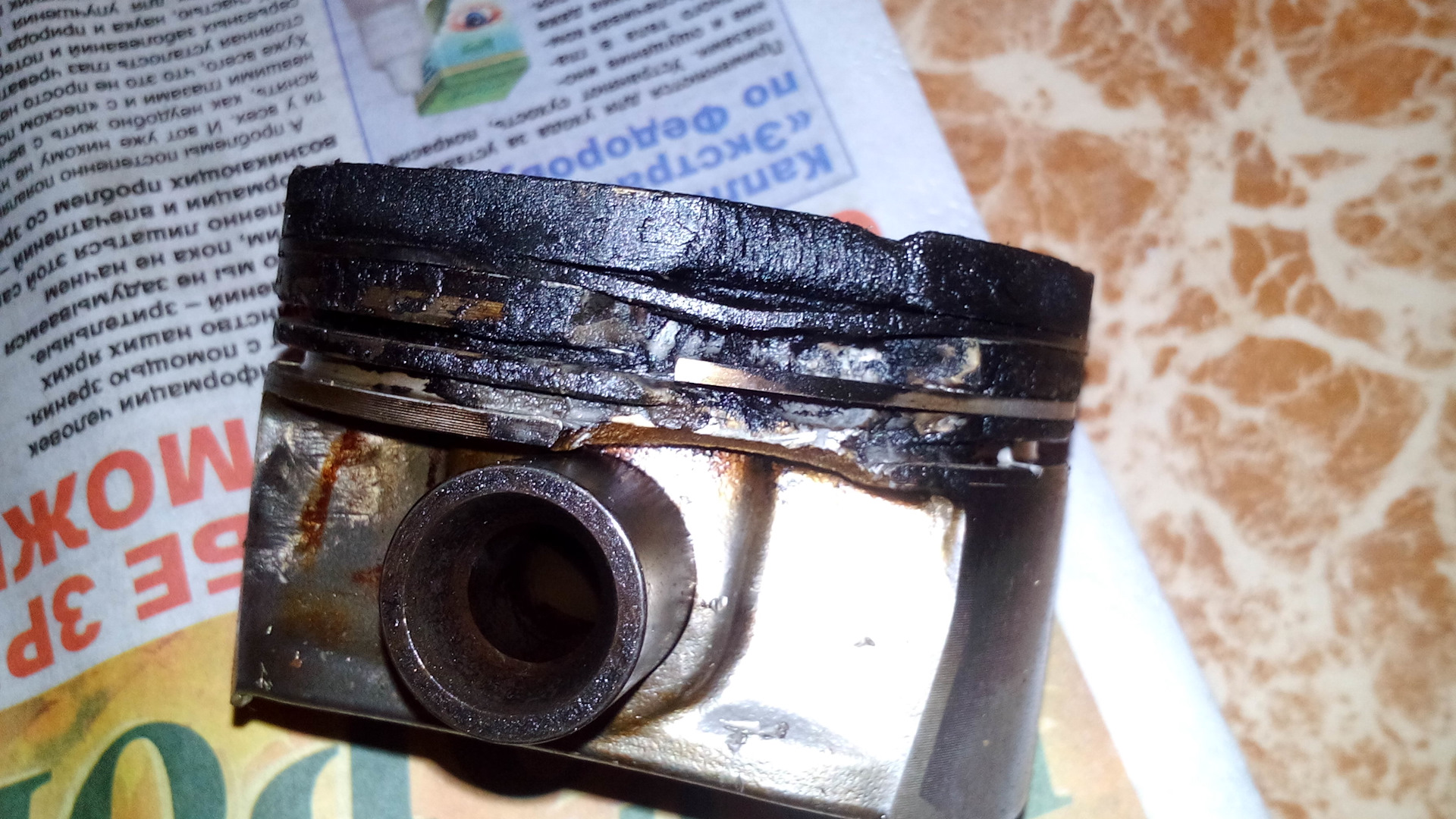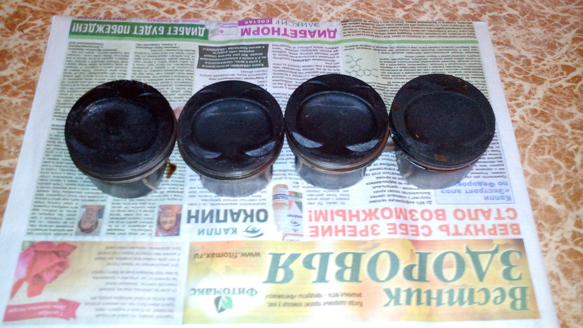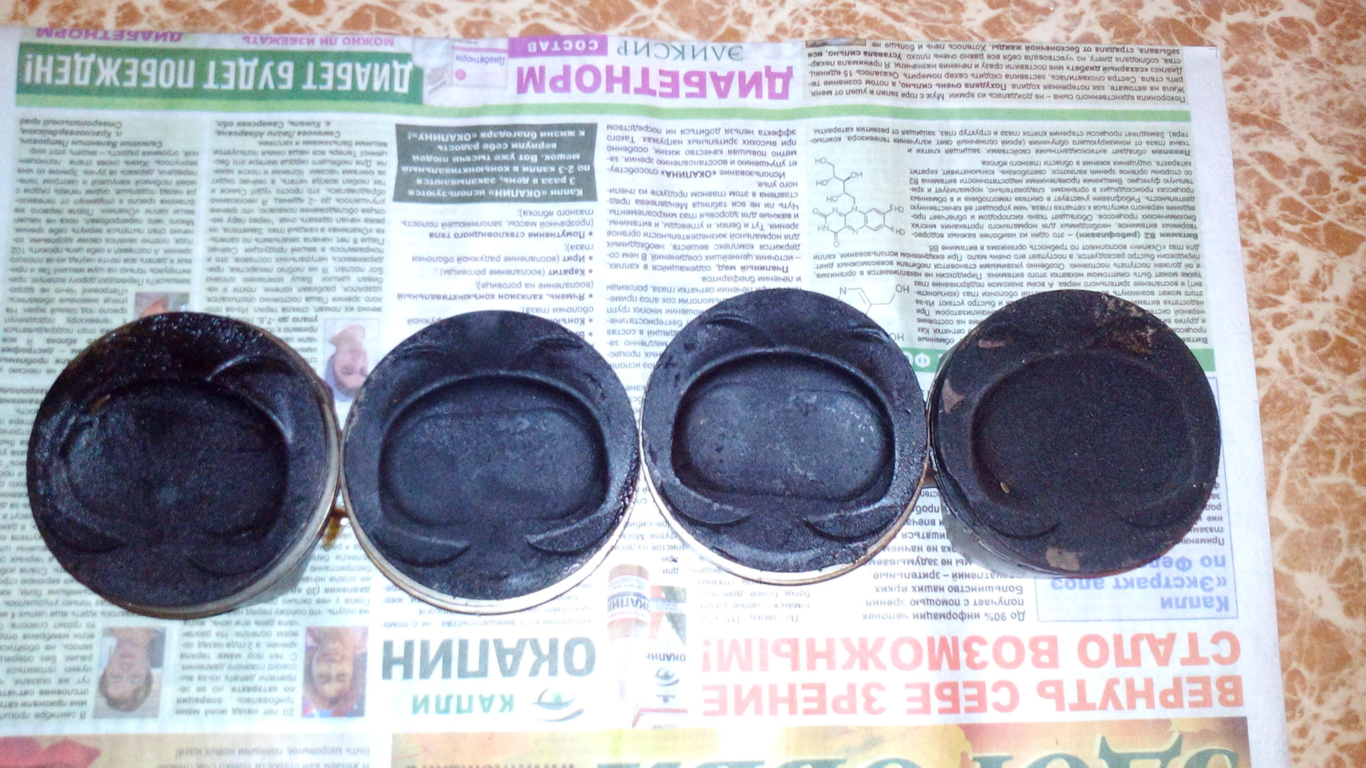 Когда писал о прогаре поршня и капитальном ремонте. Не выложил фото поршней. Нагар на всех поршнях и как раз прогоревший поршень. Если кому интересно как это выглядит)
