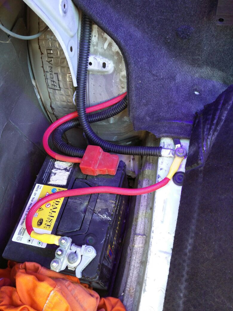 — сперва были проложены кабеля ПВ3 0,50Ga в гофре в багажник для питания усилителей, да с запасом, но идея перенести АКБ с подкапотки не давала покоя.