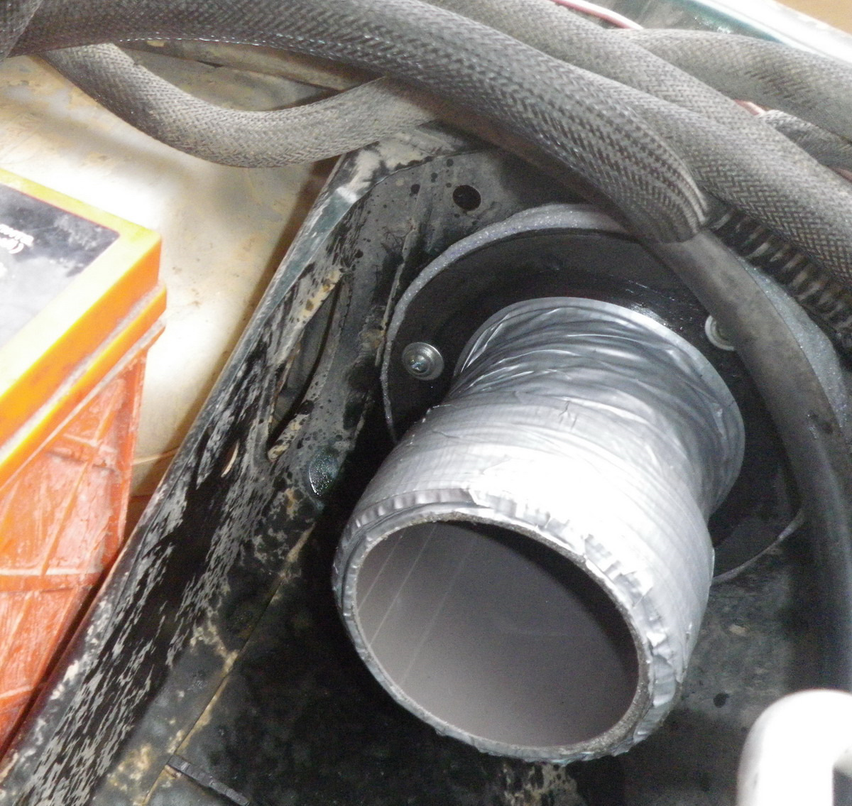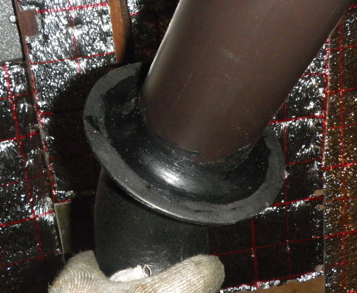 Мурловскую трубу отрезал, обмотал для прочности армированным скотчем, им же нарастил диаметр. А под фланец крепления уголка подложил прокладки, вырезанные из какой-то белой пружинистой лабуды