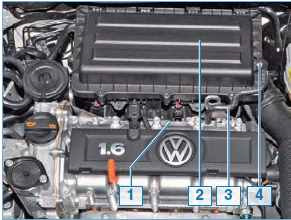 Двигатель (заводское обозначение CFNA) бензиновый, четырехтактный, четырехцилиндровый, рядный, шестнадцатиклапанный, с двумя распределительными валами. Расположен в моторном отсеке поперечно. Порядок работы цилиндров: 1—3—4—2, отсчет — от шкива привода вспомогательных агрегатов. Система питания — фазированный распределенный впрыск топлива (нормы токсичности Евро-4). Двигатель с коробкой передач и сцеплением образуют силовой агрегат — единый блок, закрепленный в моторном отсеке на трех эластичных резинометаллических опорах. Правая опора (гидравлическая) крепится к кронштейну, прикрепленному к крышке привода ГРМ, а левая и задняя опоры — к кронштейнам на картере коробки передач.