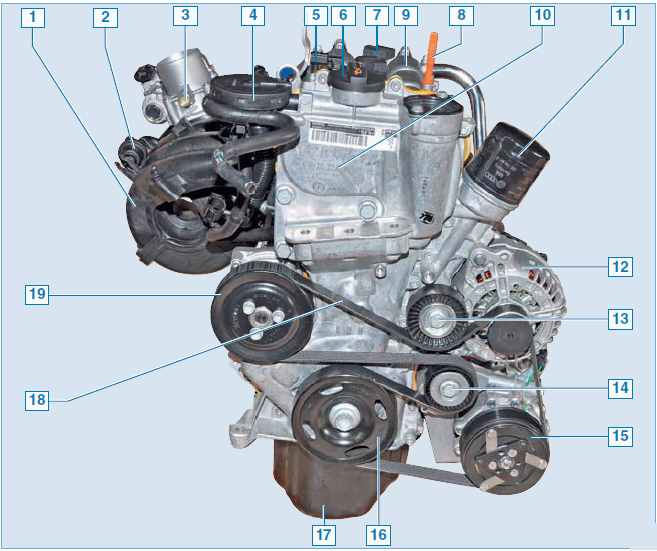 Двигатель (вид справа по направлению движения автомобиля): 1 — впускной трубопровод; 2 — клапан продувки адсорбера; 3 — дроссельный узел; 4 — клапан системы вентиляции картера; 5 — датчик положения распределительного вала; 6 — крышка маслозаливной горловины; 7 — катушка зажигания; 8 — указатель уровня масла; 9 — корпус распределительных валов; 10 — крышка привода ГРМ; 11 — масляный фильтр; 12 — генератор; 13 — опорный ролик ремня привода вспомогательных агрегатов; 14 — натяжной ролик ремня привода вспомогательных агрегатов; 15 — шкив электромагнитной муфты компрессора кондиционера; 16 — шкив привода вспомогательных агрегатов; 17 — поддон картера; 18 — ремень привода вспомогательных агрегатов; 19 — шкив насоса охлаждающей жидкости.
