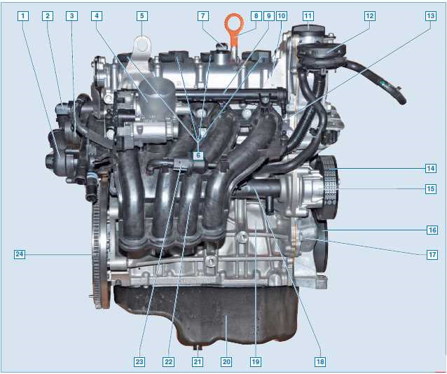 Двигатель (вид сзади по направлению движения автомобиля): 1 — крышка основного термостата; 2 — датчик температуры охлаждающей жидкости; 3 — распределитель охлаждающей жидкости; 4 — дроссельный узел; 5 — рым; 6 — катушки зажигания; 7 — датчик положения распределительного вала; 8 — указатель уровня масла; 9 — топливная рампа; 10 — корпус распределительных валов; 11 — крышка маслозаливной горловины; 12 — клапан системы вентиляции картера; 13 — головка блока цилиндров; 14 — ремень привода вспомогательных агрегатов; 15 -насос охлаждающей жидкости; 16 — шкив привода вспомогательных агрегатов; 17 — крышка привода ГРМ; 18 — труба подвода охлаждающей жидкости к насосу; 19 — блок цилиндров; 20 — поддон картера; 21 — пробка сливного отверстия; 22 — впускной трубопровод; 23 — клапан продувки адсорбера; 24 — маховик.