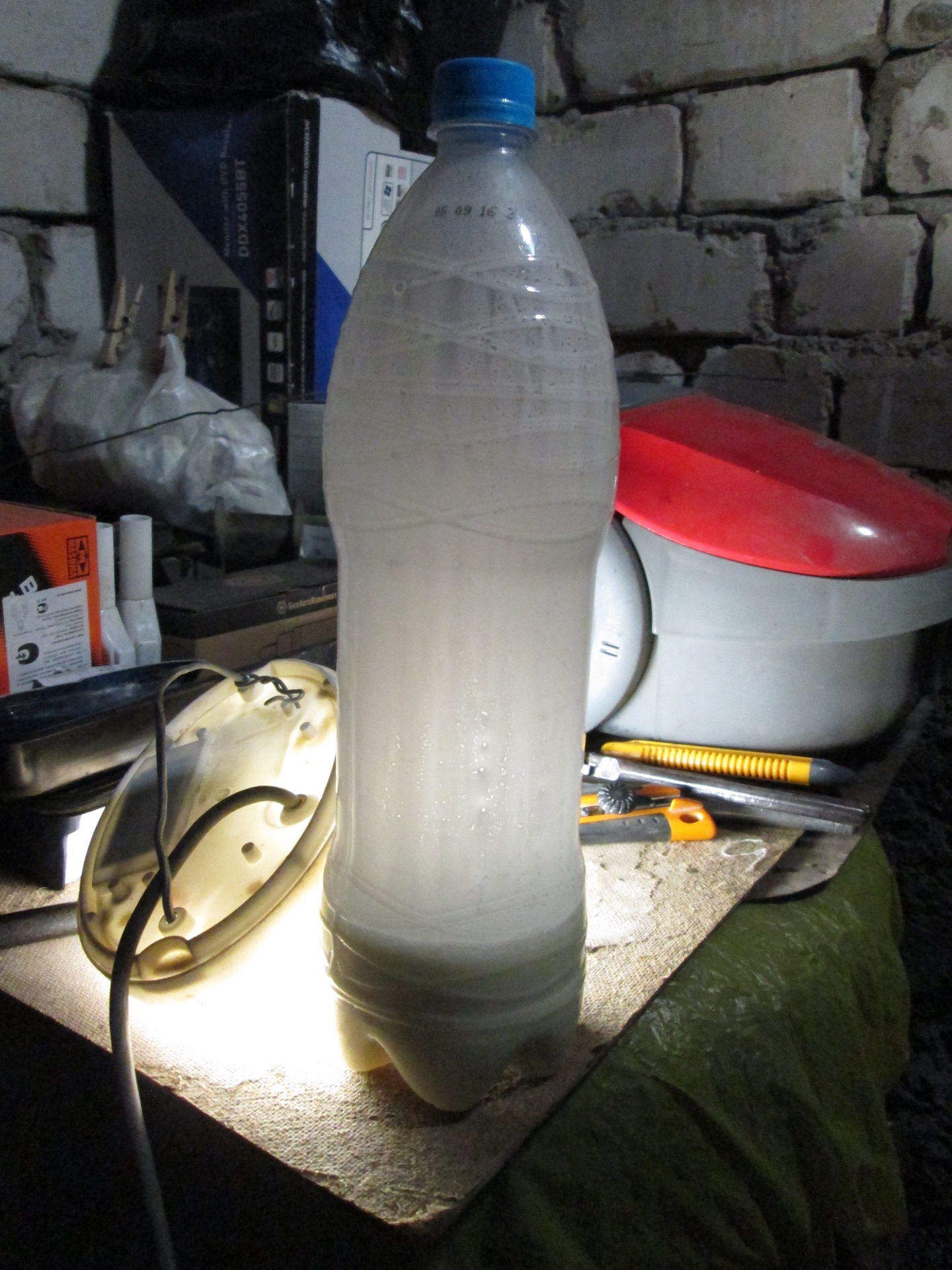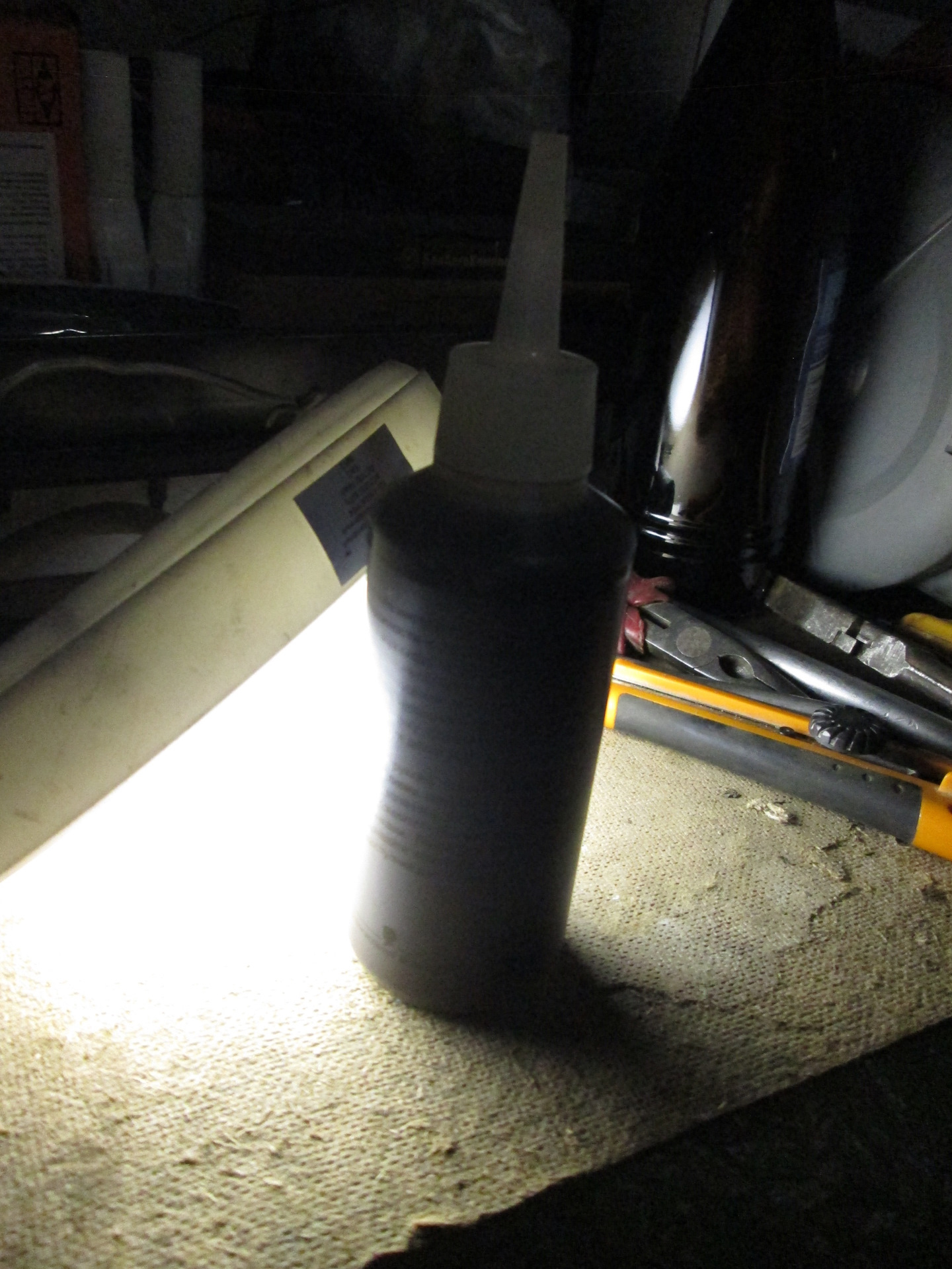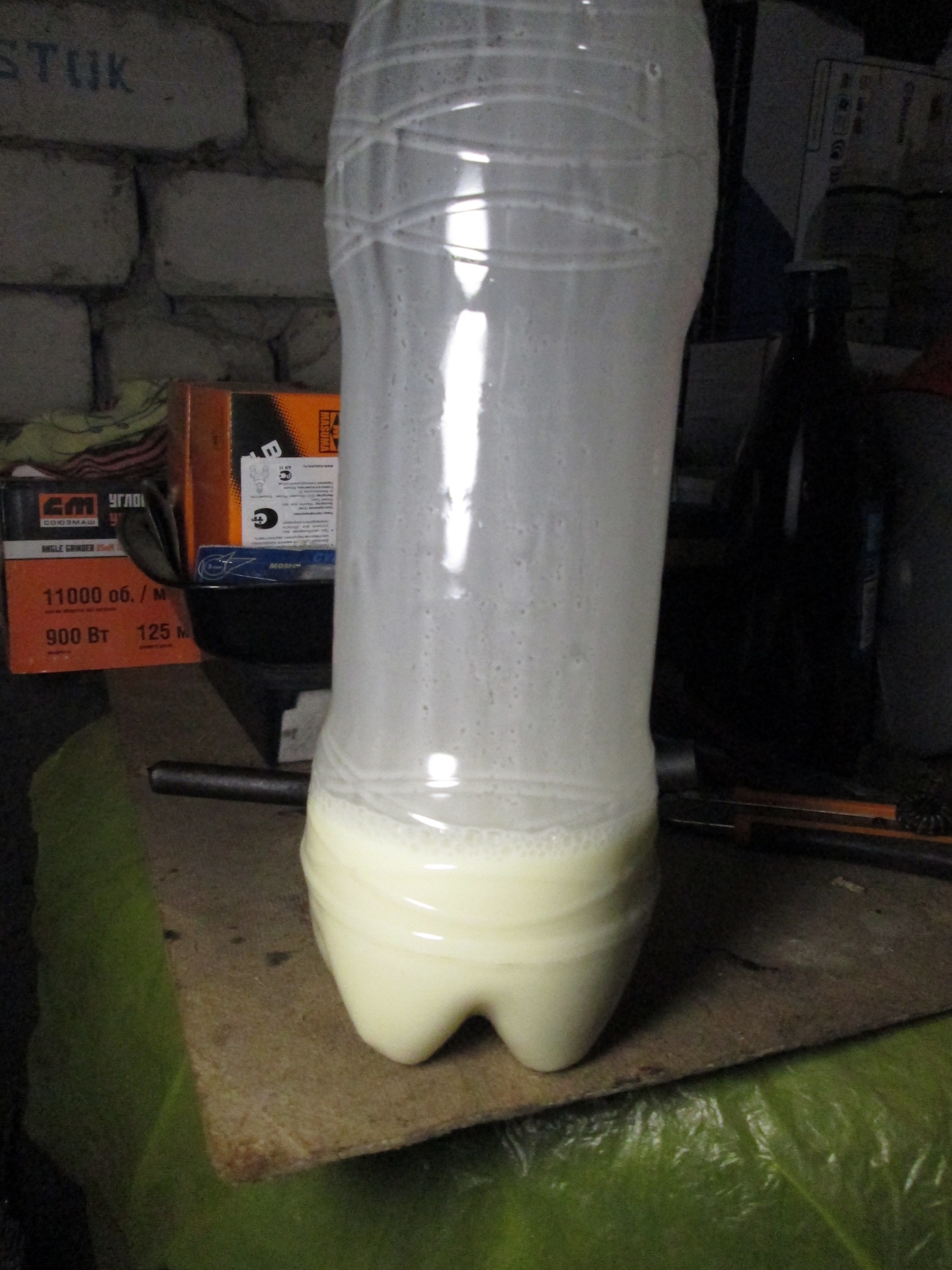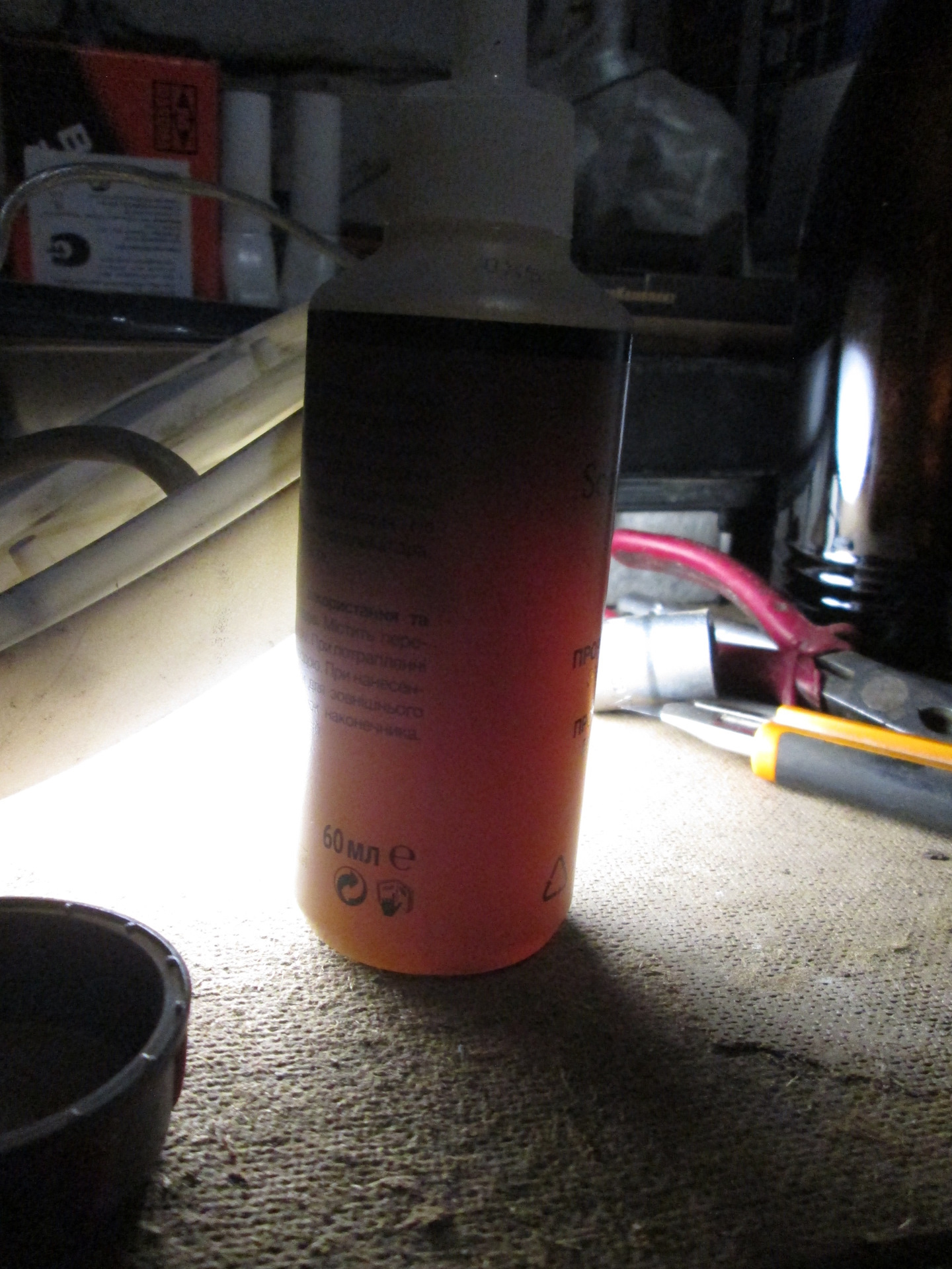 Далее начал готовить адовую жидкость, берем: 180-200 мл. нашатыря, 60 мл. растворителя и уайт-спирита, 100 мл керосина и 150 мл масла моторного. Вещества разместились по плотности. Далее продолжительно встряхиваем содержимое вот смесь готова. Из прозрачной разной плотности превратилась в консистенцию и цвет молока.