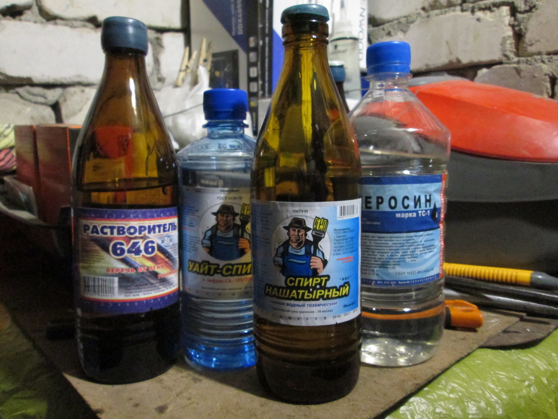 Были куплены следующие ингредиенты: керосин, растворитель 646, уайт-спирит и нашатырный спирт.