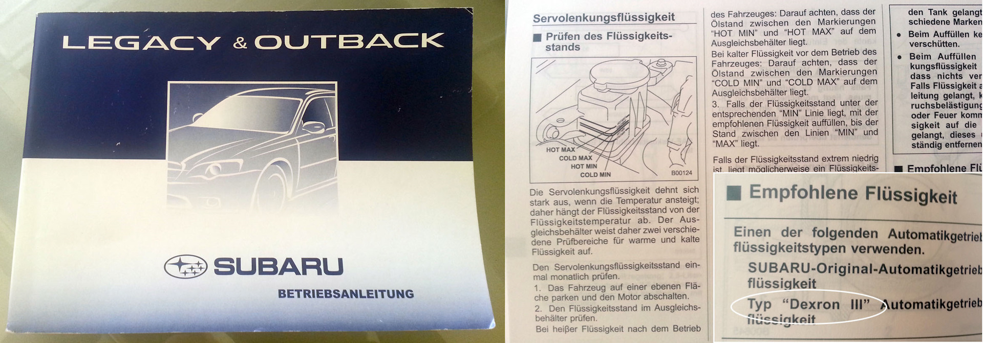 На форуме нашёл инфу, что Subaru ATF- K0410Y0700 выпускалось с 2000г. (на минеральной основе) как Dexron II, а с 2007г. стало Dexron III (на синтетической основе). На крышке ГУР существует только подсказка в виде "use ATF Dexron".