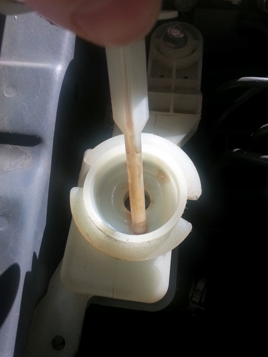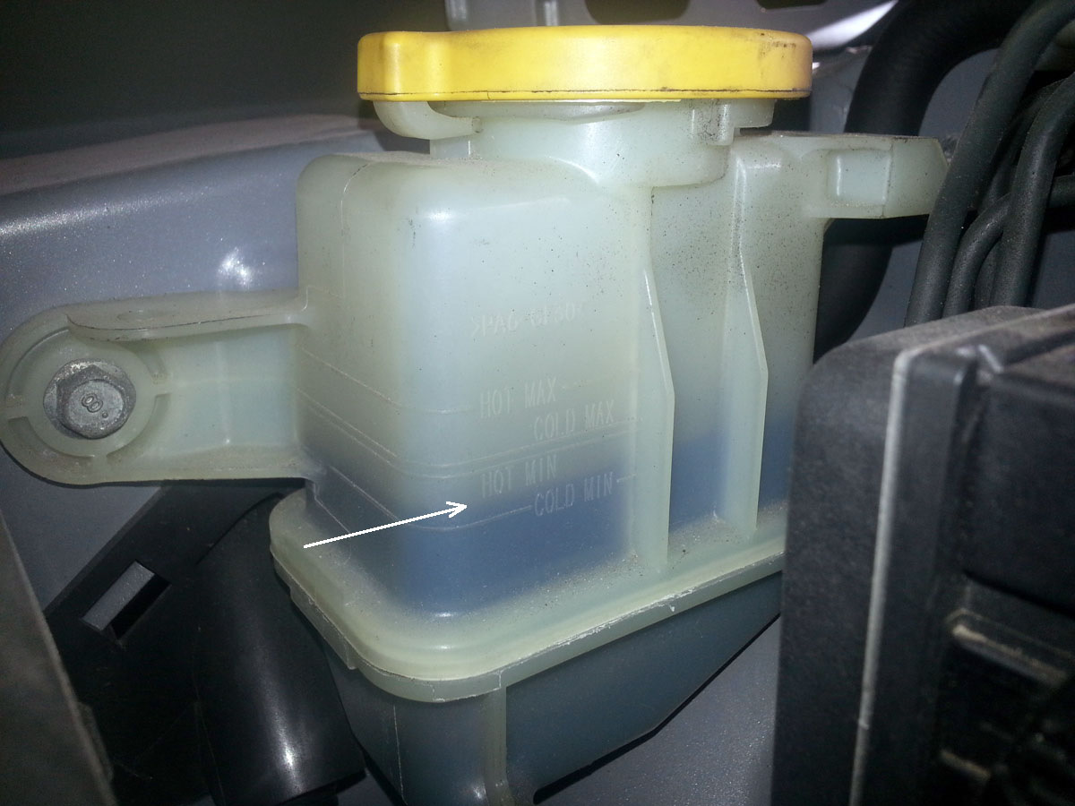 В мануале написано, в зависимости от температуры, жидкость должна быть всегда между делениями (MIN) и (MAX). Вообщем слегка ниже положенного уровня у меня получается.