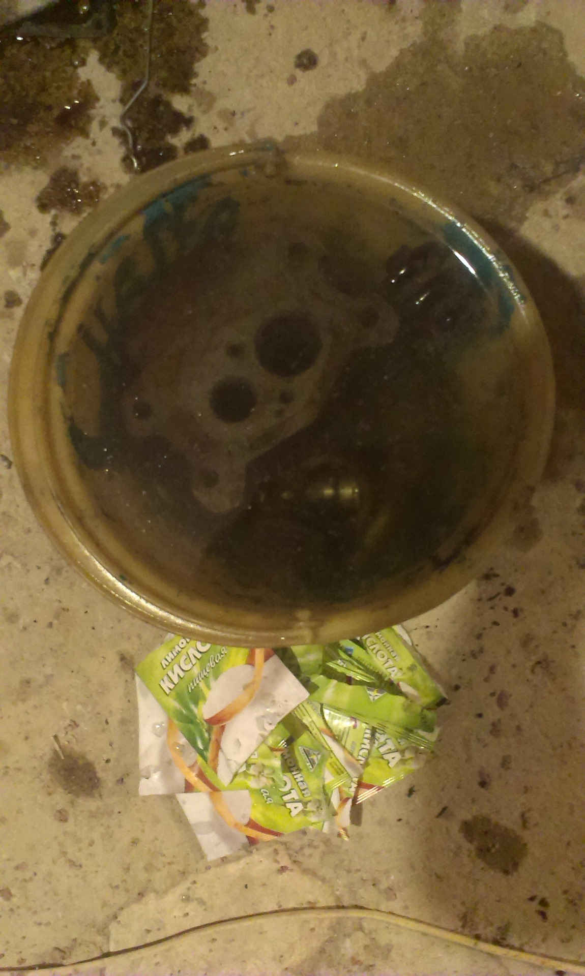 Всё это хозяйство (за исключением поршней) было погружено в перенасыщенный раствор лимонной кислоты, для приведения в нормальный вид, а также с целью удаления продуктов жизнедеятельности