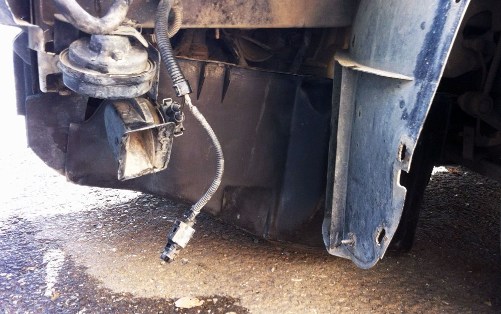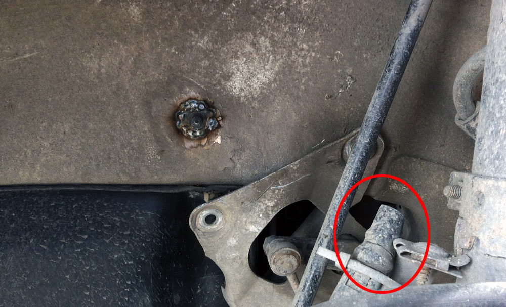 2. Пыльник двигателя левый — оставался оригинальный еще от "красного донора", пока ставил сломал шпильку кронштейна датчика уровня фар, пришлось заварить временно подходящий болт. На фото еще запалился "тюннинг" датчика износа тормозных колодок от "мастеров" что ковыряли рку до меня.
