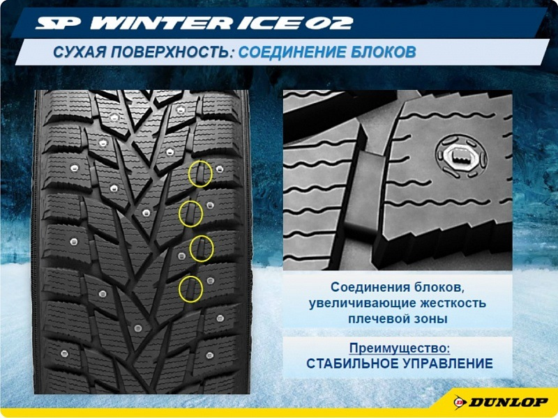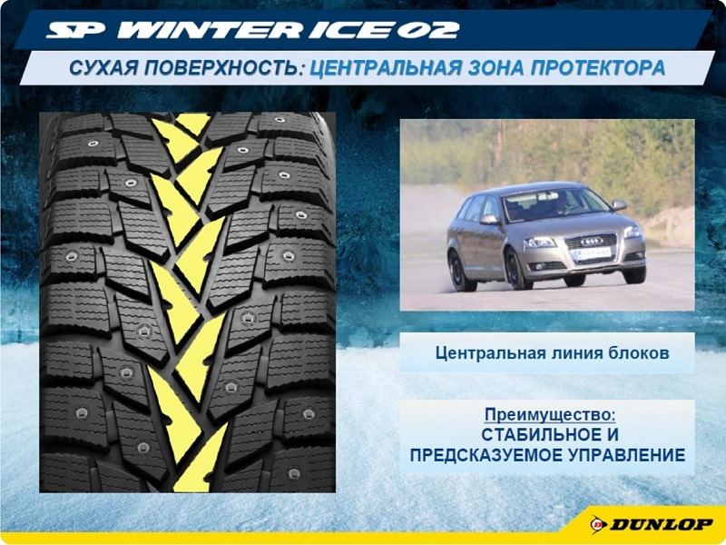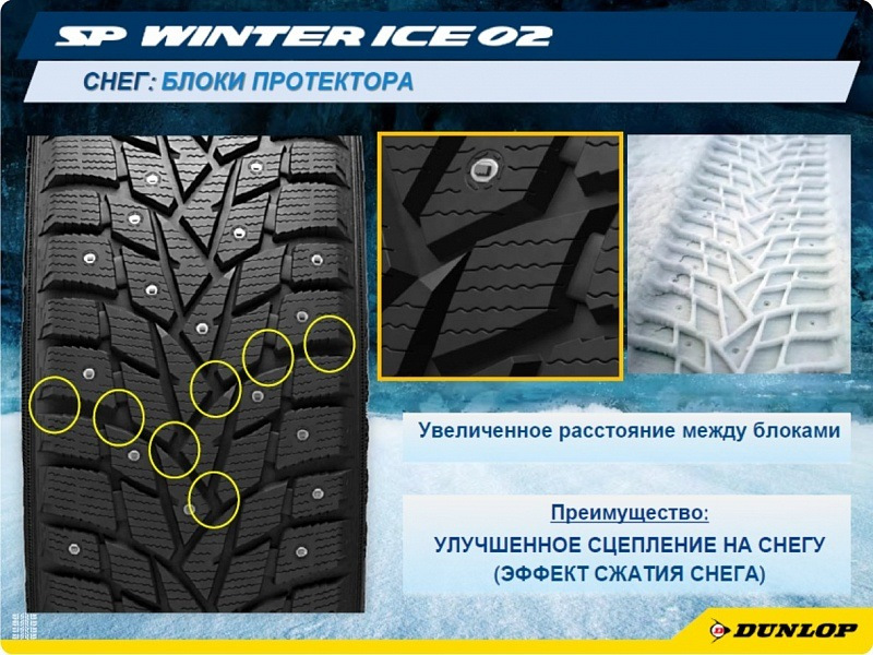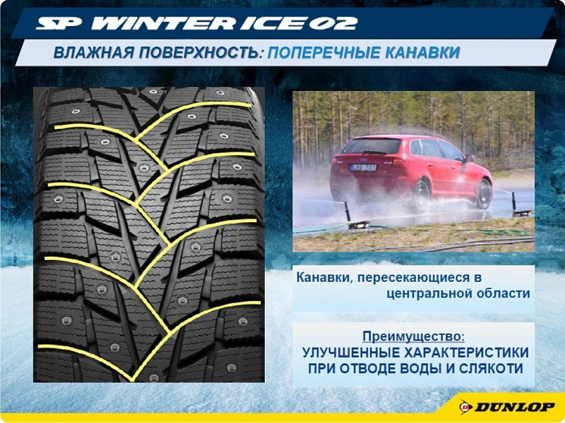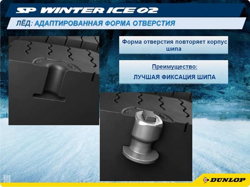Прежде чем отправиться на лед, немного теоретического материала. Новые шины Dunlop SP Winter Ice02 и Grandtrek Ice02 от предыдущей модели отличает уникальный дизайн протектора. Он легко узнаваем, а его мощные блоки говорят о том, что эта шина предназначается для суровых зим с большими заносами и обледенелыми участками дорог. Дизайн боковины с ледяными вершинами и снежинками подчеркивает предназначение шины для зимних условий эксплуатации. Особый направленный рисунок центральной части протектора в виде треугольников значительно улучшает отвод воды и снежной массы, а также повышает стабильность управления. Уникальный дизайн дренажных канавок, заходящих на центральную часть протектора, также помогает эффективнее убирать из зоны пятна контакта воду и снежную массу. В плечевой зоне блоки протектора зимних шипованных шин Dunlop соединены друг с другом мостовыми перемычками, что повышает стабильность управления на всех типах покрытия. Увеличенный размер канавок и блоки протектора с фасками, эффективно утрамбовывающие снег, повышают проходимость шин на рыхлом снежном покрытии.