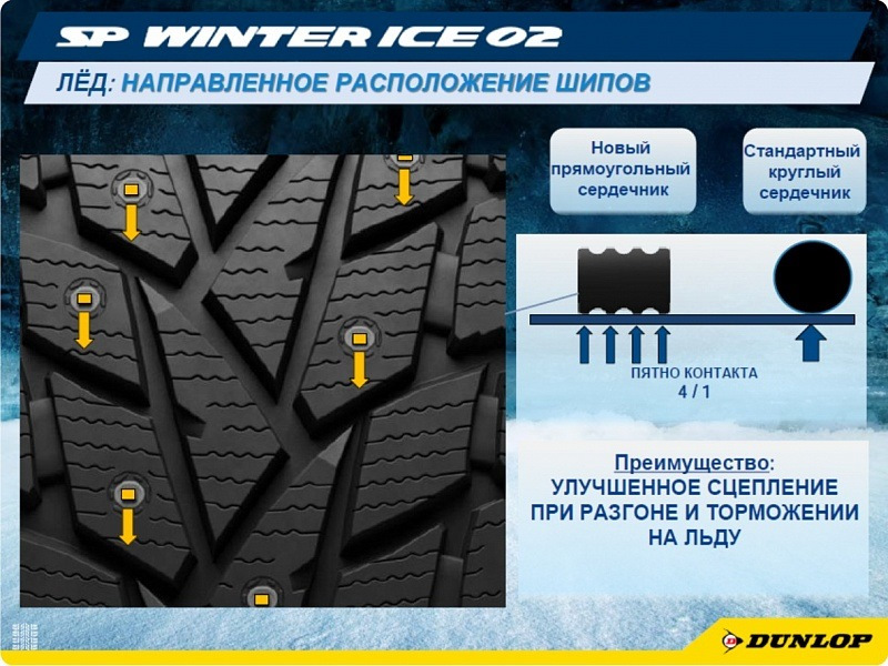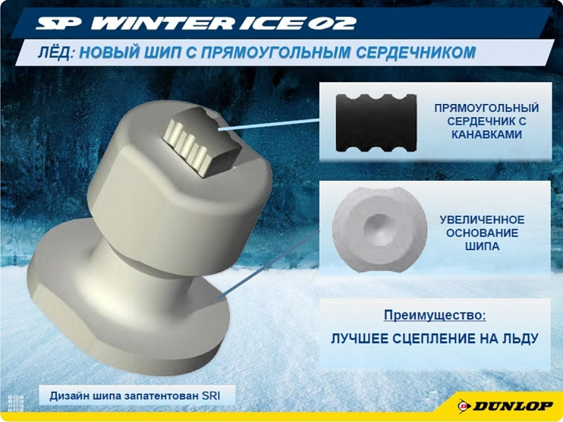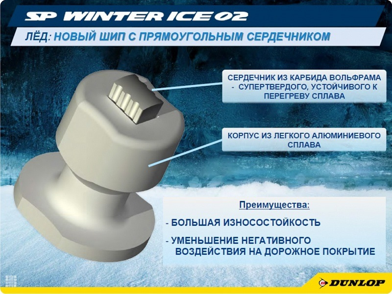 Направленные шипы с прямоугольным рифленым сердечником – главный секрет великолепных сцепных качеств новых зимних шин Dunlop SP Winter Ice02 и Grandtrek Ice02 на льду. Особая форма и размер сердечника (2,8 мм x 2 мм), а также большое основание шипа (9 мм x 8 мм) обеспечивают повышенную проникающую способность и стабильность рабочих характеристик при движении по льду. Сердечник изготовлен из карбида вольфрама — твердого и устойчивого к перегреву материала. Корпус шипа сделан из алюминиевого сплава, что позволяет ему быть значительно легче, чем на предыдущих моделях.