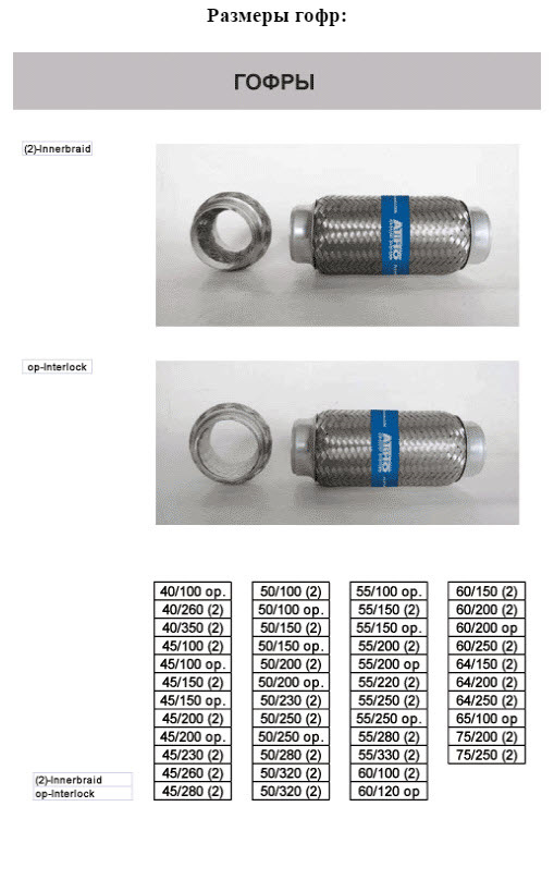 Таким образом гофры глушителей отличаются прочностью, исходя из типа конструкции. Оригинальная гофра глушителя, чаще всего, имеет конструкцию interlock и называется также — "усиленная гофра" и она служит дольше.