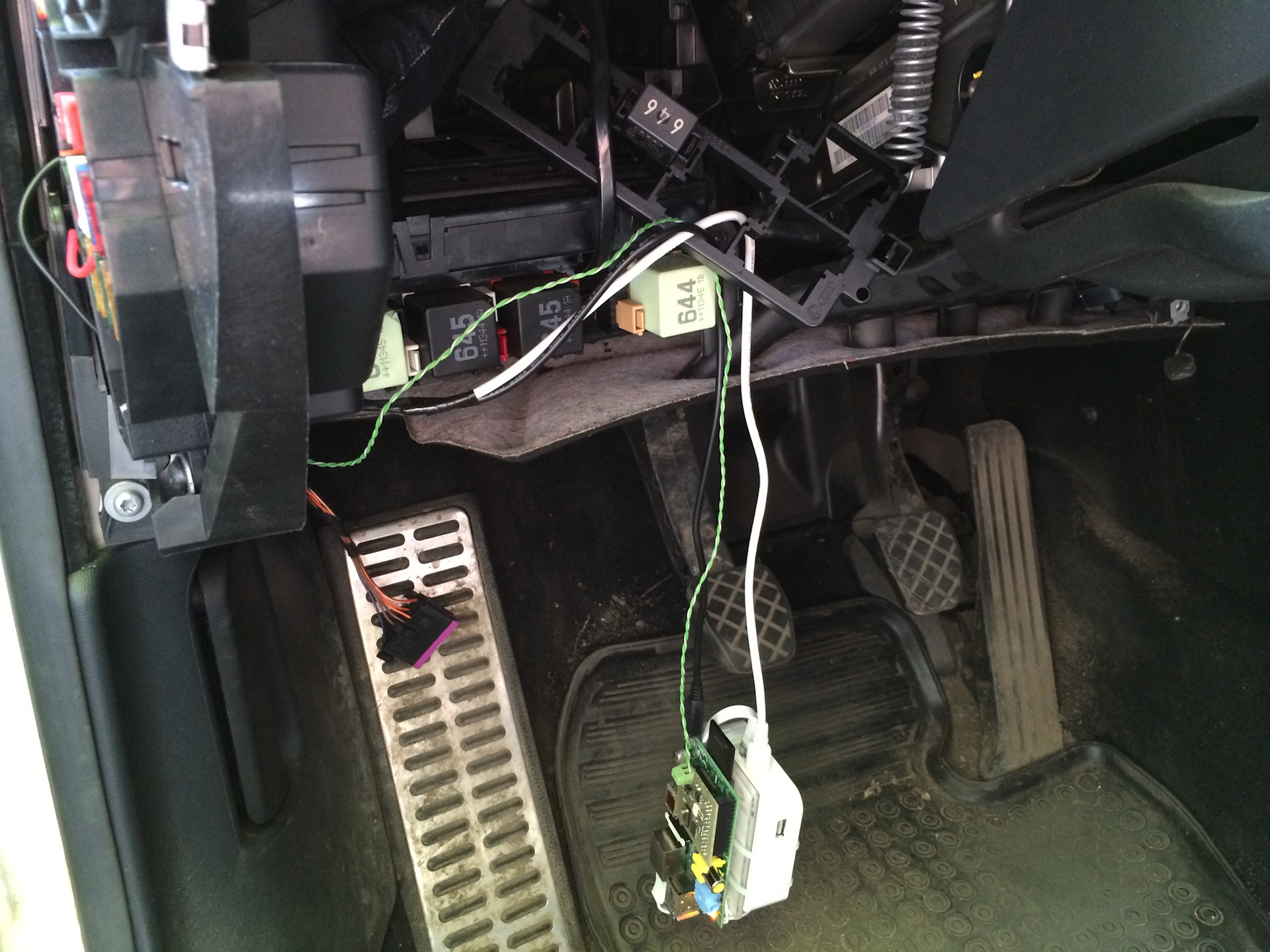 3) Для управления с телефона нужен еще WiFi роутер, нашел маленький TP-Link, связал их с Raspberry Pi и запихнул в нишу под рулем, благо у меня там места много.