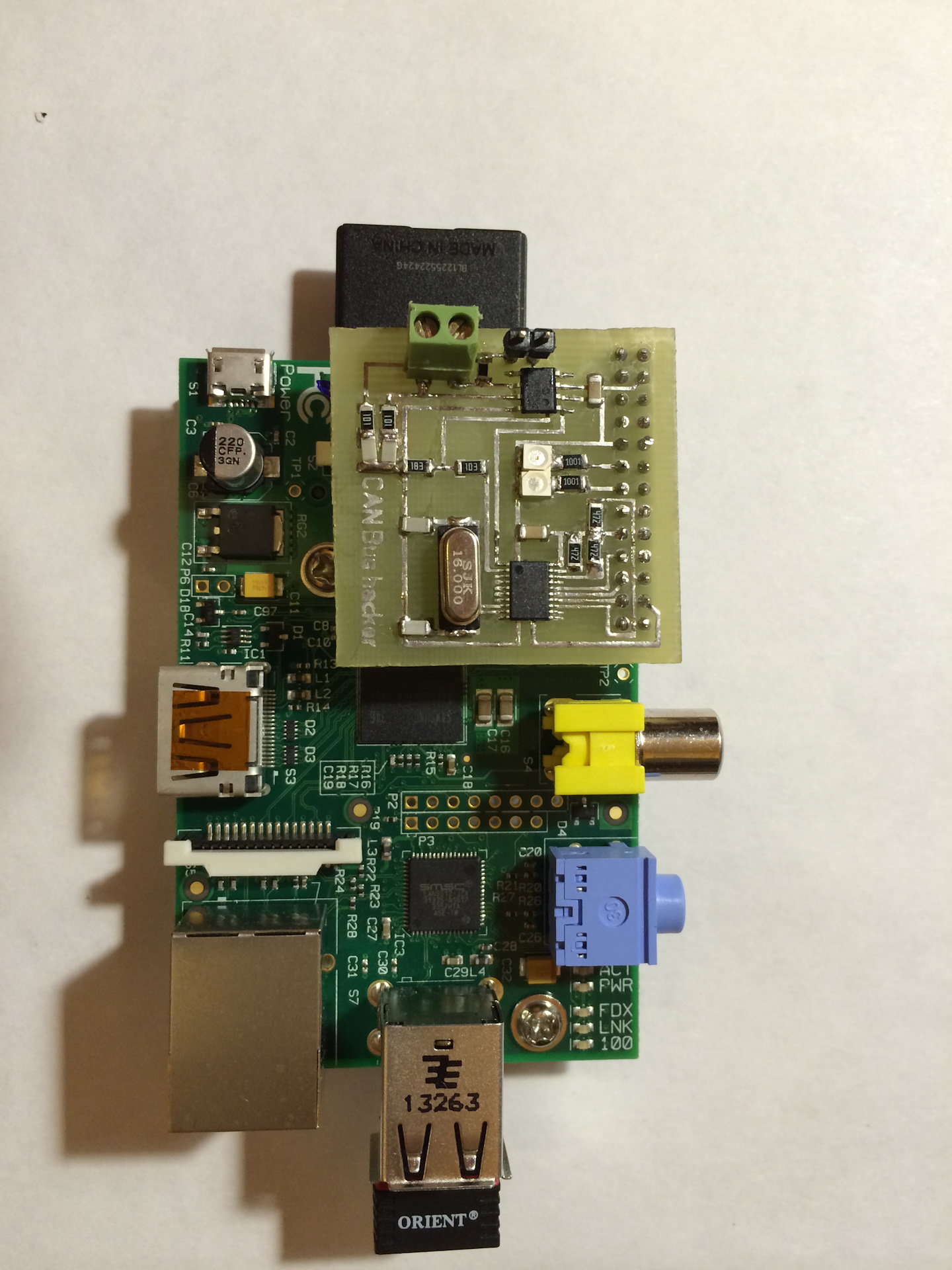 1) Я спаял шилд с CAN чипом для Raspberry Pi. Шилд нужен, чтобы получать/отправлять команды по CAN шине с компьютера Raspberry Pi.