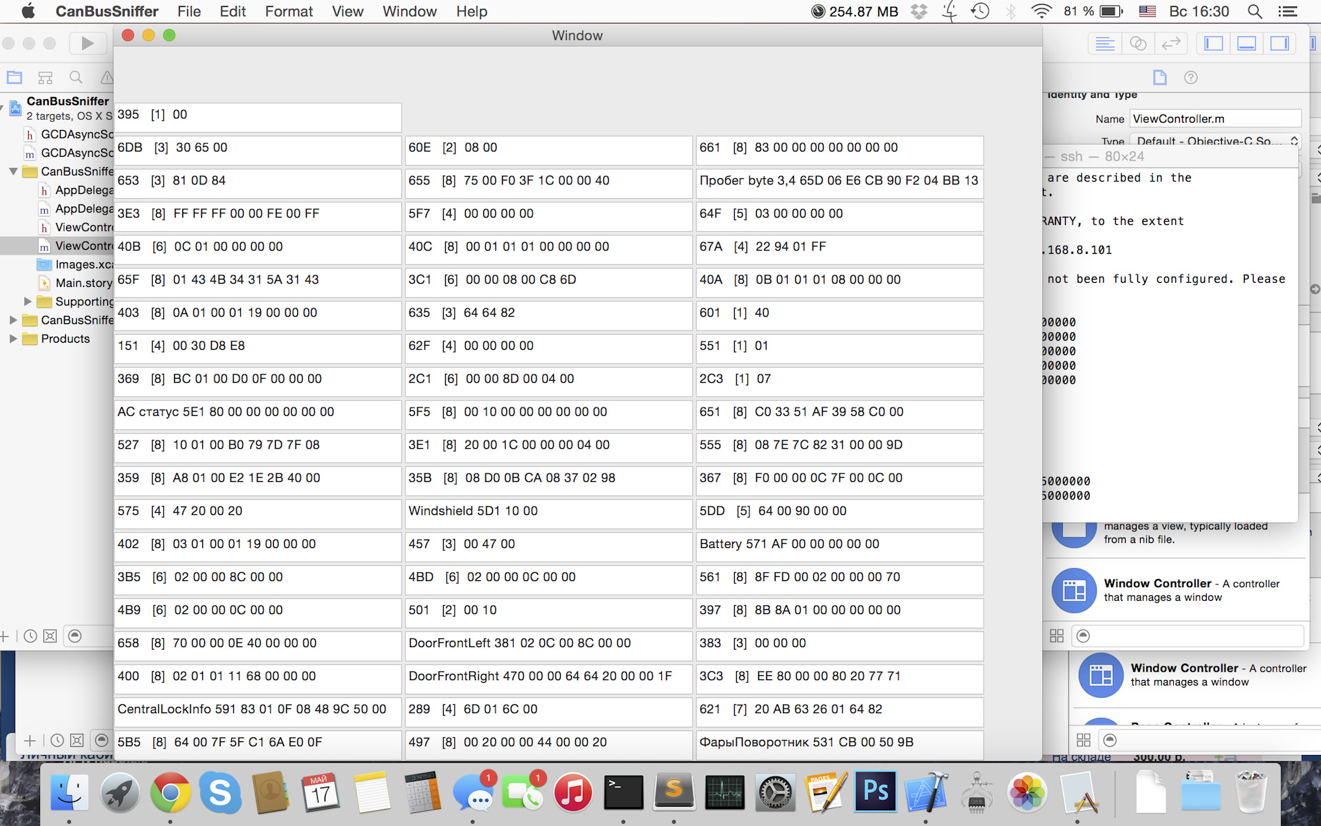 5) Закрываем все, подключаемся с компьютера по WiFi к CAN шине и сканируем шину. Я написал программу, которая перехватывает все команды от всех устройств в машине. Чтобы узнать какую именно команду передает кнопка стеклоподъемника, я нажимаю и смотрю в какой ячейке изменились значения. Таким способом я вычислил все интересующие меня устройства (стекла, замок, фары, и чего то еще).