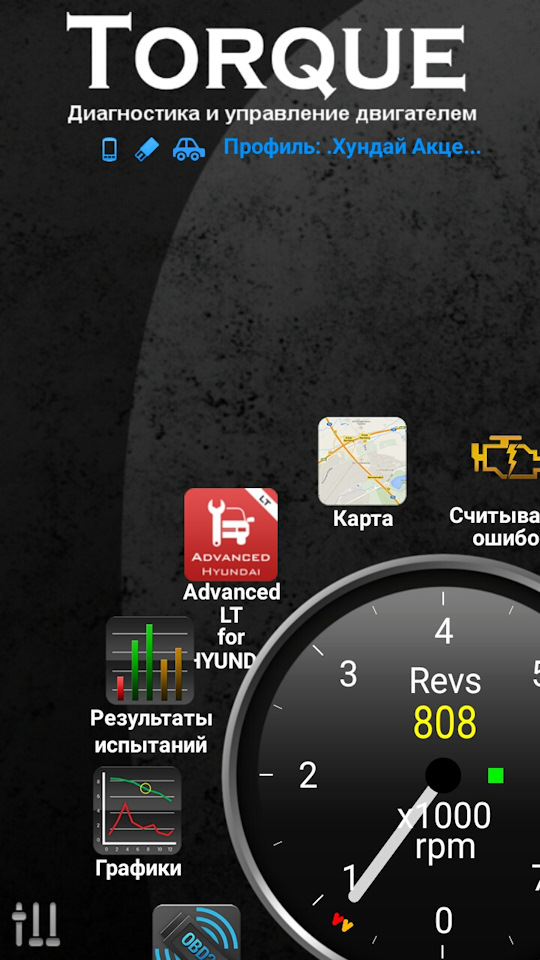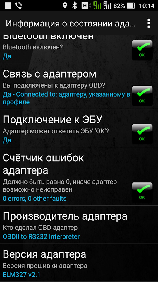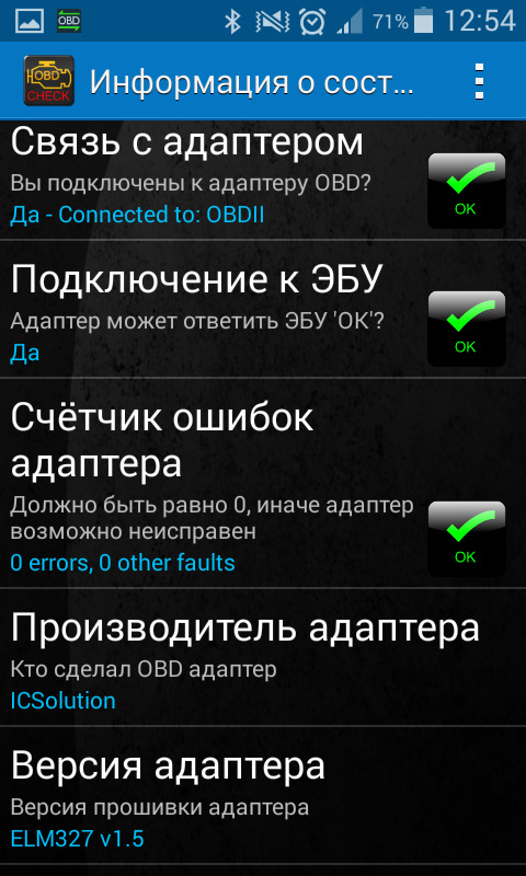 5 Открываем прогу Torque. (когда прогу запустите первый раз она попросит создать профиль создайте его). заходим "Состояние адаптера" и убеждаемся что соединение установлено.