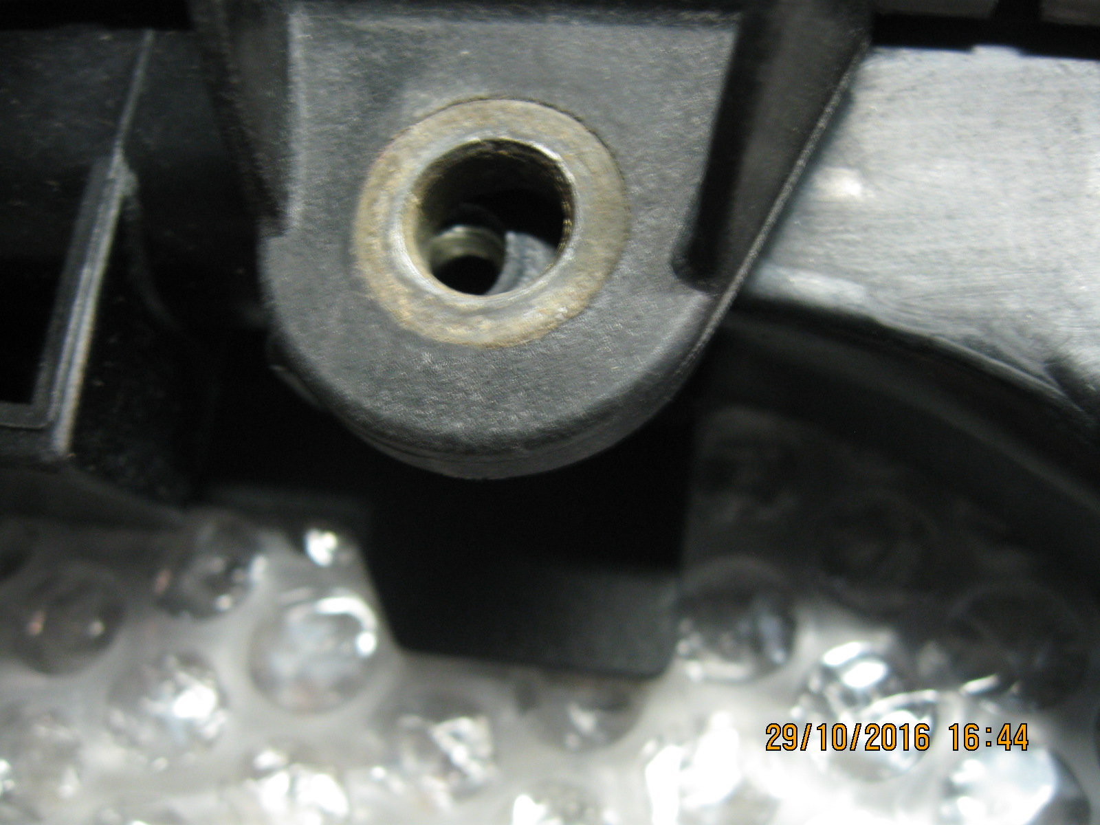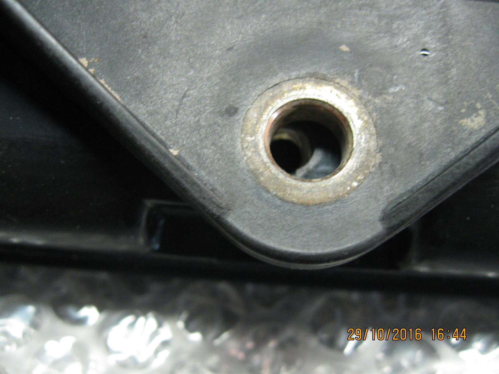 К тому же жесткой (родная мягкая). Плюс ко всему верхний штырек радиатора не очень хотел в нее садиться. Точнее садился, но в серьезную натяжку. Так ставить было нельзя. Был риск сломать штырек. Что, кстати, и было на старом радиаторе! Решил подточить натфелем отверстие, сделать его подлиннее. Натфель сопротивлялся. Пришлось взять более грозное оружие — дрель и сверло. Опора реально из жесткого пластика. Заказал уже оригинальную. Как только придет — сразу поменяю.