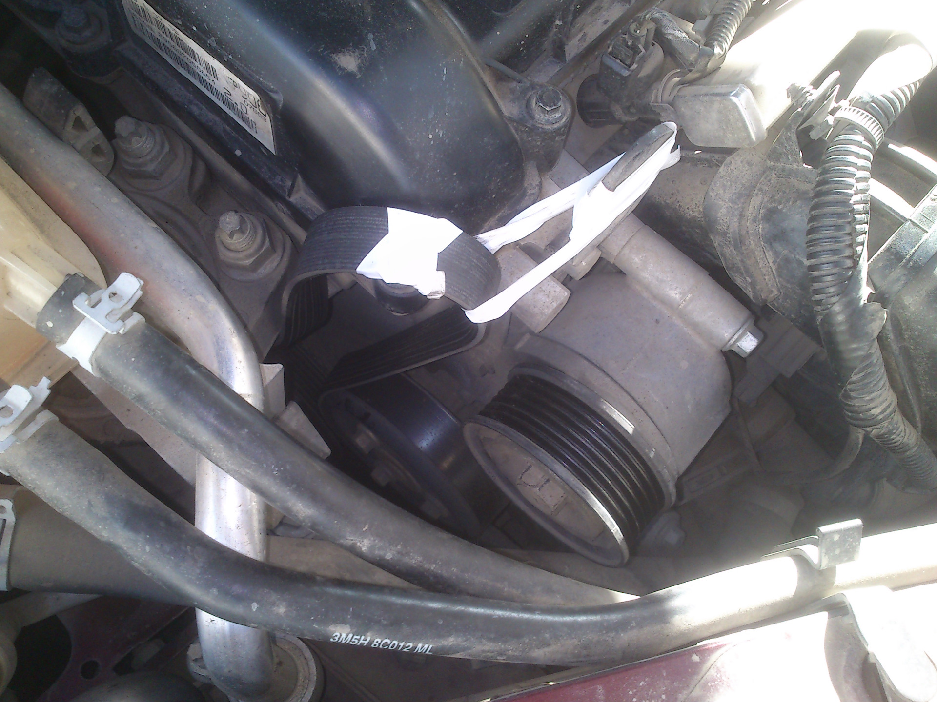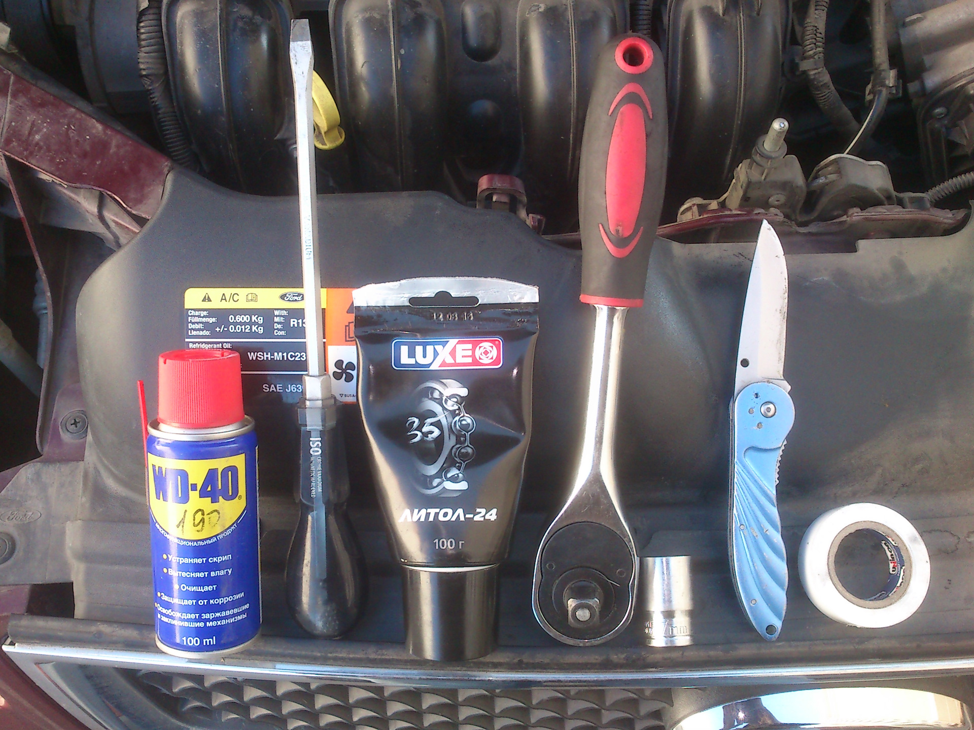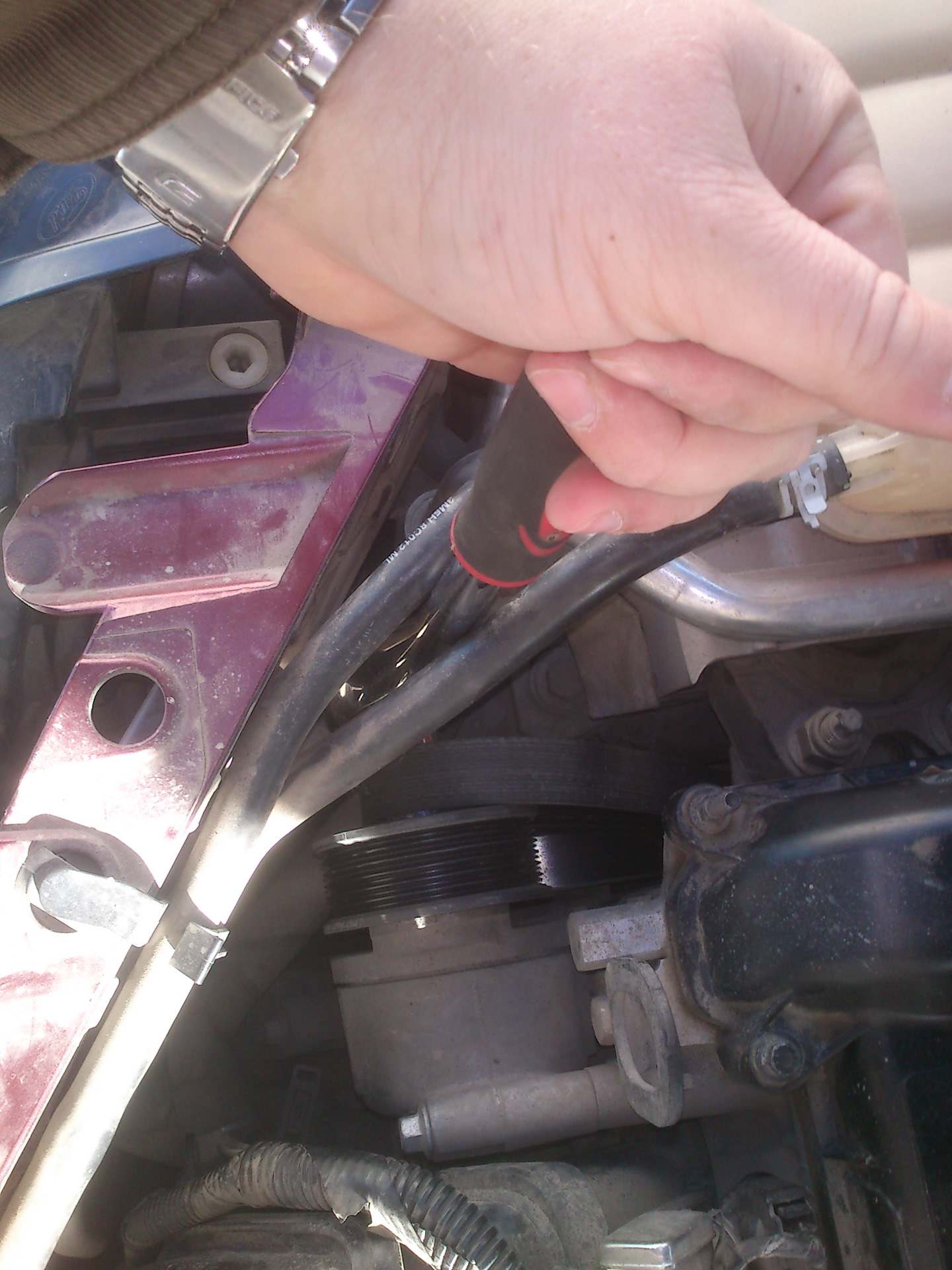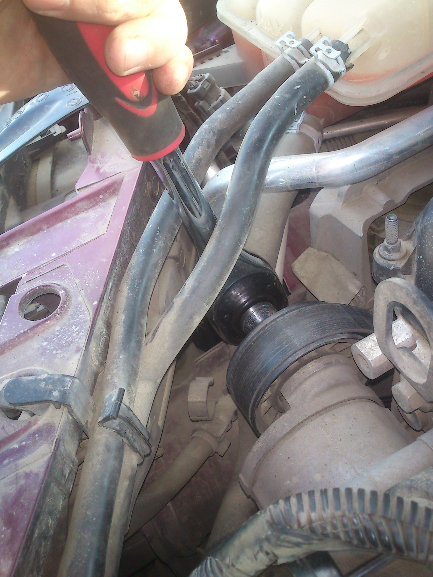 Так вот, при помощи трещётки и накидной головки на 17 оттянул натяжной ролик к лобовому стеклу и аккуратно скинул ремень, привязал его изолентой ( верёвки под рукой не было) к двигателю.