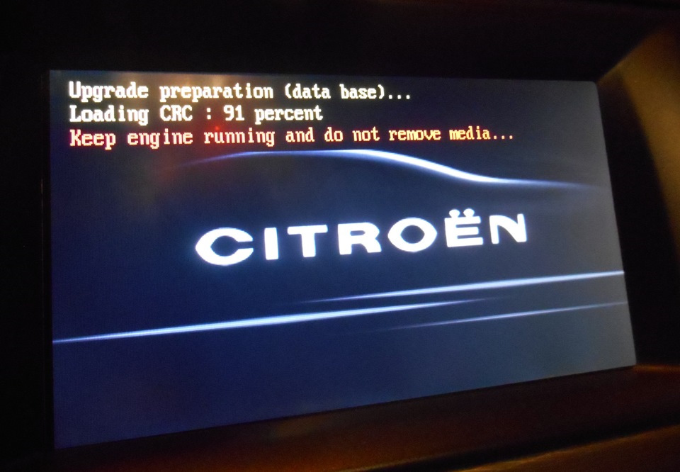 Скачиваем архив. Нам понадобится любая програма, которая работает с *.iso файлами. Их большое количество, но я уже давно пользуюсь UltraIso. При помощи UltraISO записываем файл с прошивкой на CD на самой низкой скорости. CD приводы в магнитоле очень привередливые и не читают всё подряд, а, тем более, записанные на высоких скоростях. Заводим движок, т.к. прошивается/русифицируется/устанавливаются карты только на заведённом движке. Вставляем CD с прошивкой и, если оно спрашивает, нажимаем yes и наблюдаем похожую картинку минут 20-30 в зависимости от того, как быстро считывается информация с CD.