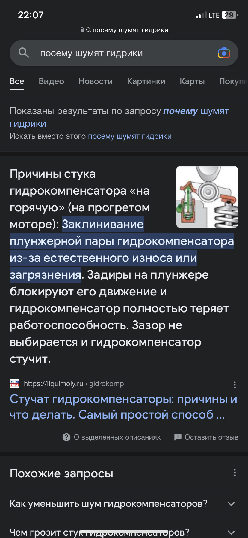 Народ стучат гидрокомпенсаторы на холодную и обычно когда машина ездила короткие расстояния перед стоянкой ночной, либо просто перегонял с места на место машину.Не знаю почему но иногда гидрики молчат при прогреве особенно часто это вижу когда машина после хороших пробегов ночь простоит.Думаю ехать в выходные к официалам пусть за бабки поменяют их. Но когда им звонил сказали чаще всего неисправен обратный клапан мысленного канала и предложили его первым делом проверить и не менять сразу гидрики.Что посоветуйте мне так как в выходные наверное буду уже у официалов.Может быть обратный клапан шалит?